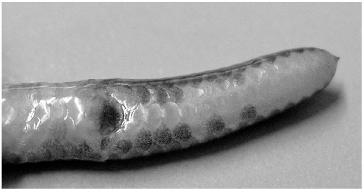 Measurements. Total length 265 mm; tail length 14.4 mm; relative tail length (or tail/LOA) 5.4%; horizontal diameter of body at head 3.8 mm, diameter at midbody 4.7 mm, diameter of body at base of tail 4.4 mm; diameter of head at interocular level 3.4 mm; relative rostral width 1.4; relative body proportion (or length/width ratio) 56.4; tail length/tail width ratio 3.27; rostral width/head width ratio 0.71.