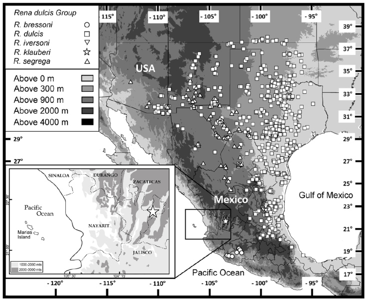 The map for the species of the Rena dulcis group was generated with information gathered from the following collections: AMNH, ANSP, AUM, BMNH, BYU, CAS, CM, CNAR, CU, UF (FLMNH), EHT-HMS, FMNH, INHS, KU, LACM, LSU, MCZ, MPM, MSB, MSUM, MVZ, MWSU (Midwestern State University), MZFC, NLU, OMNH, OS, PSM, SDMNH, SM (BCB), SNIB (Sistema Nacional de Información sobre Biodiversidad de México), SRSU, TCWC, TNHC, TTU, UAZ, UCM, UIMNH, UMMZ, UNL (Universidad de Nuevo León), UOMZ, USNM, UTA, UTEP, WTSU (West Texas A&M University), YPM. Localities were obtained directly from museum collections, the HerpNET database (October 2009), from Dixon and Vaughan (2003). Museum acronyms can be found in Sabaj (2016).