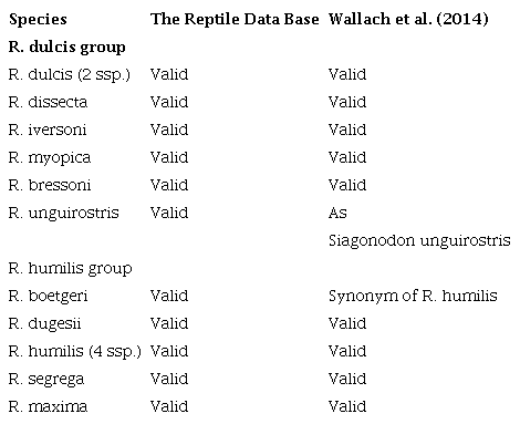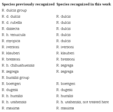 Below we discuss the status and validity of some taxa in the R. dulcis-humilis groups, particularly as impacted by our newly rearranged groups, and the new species described here. The R. humilis group is presented first for ease of discussion.