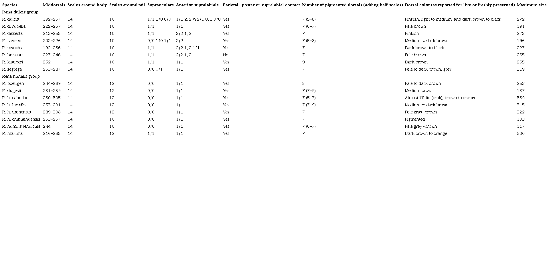 In summary, we recognize 9 species in the Rena dulcis-humilis groups, including R. bressoni and R. maxima (Table 3). We do not recognize any subspecies for R. dulcis. Within R. humilis we recognize tentatively 2 subspecies, both with 12 scales around the tail and lacking supraoculars (Tables 2, 3). The R. dulcis and R. humilis groups are mainly separated from each other, in the northern part of their distribution, by the Cochise Filter Barrier between the Sonoran and Chihuahuan deserts.