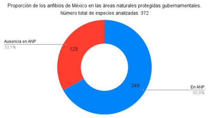 De las más de 400 especies de anfibios de México, 249 se encuentran distribuidas en al menos una ANP gubernamental, lo cual representa más de la mitad de especies del territorio mexicano. Por ello, un buen manejo y cuidado de estas áreas de protección juega un papel importante para la conservación de este grupo de vertebrados amenazados (Herrera-Izaguirre et al., 2018; Nori et al., 2015). Por otro lado, solo 141 especies de las más de 400 presentes en México se encuentran distribuidas en al menos una ANP privada, lo cual podría explicarse por la menor extensión de superficie y menor cantidad de estas áreas en comparación con las gubernamentales. Sin embargo, sigue siendo importante tener en cuenta que las áreas de protección privada podrían jugar un papel importante en la conservación de algunos anfibios (Ochoa-Ochoa et al., 2009); por ejemplo, 28 especies se encuentran solo en este tipo de ANP. El hecho de que 95 especies de anfibios no se encuentren en al menos una ANP, podría ser un indicador del posible peligro al que se podrían enfrentar estas especies si no se toman las medidas necesarias para su protección, más aún, cuando 62 de éstas (65%) son microendémicas, es decir, tienen un área de distribución de 100km2 o menos, equivalentes a 10,000 ha (Ochoa-Ochoa et al., 2014), lo cual hace a estas especies de anfibios inevitablemente más vulnerables a cualquier cambio ambiental (Ochoa-Ochoa et al., 2011, 2012).