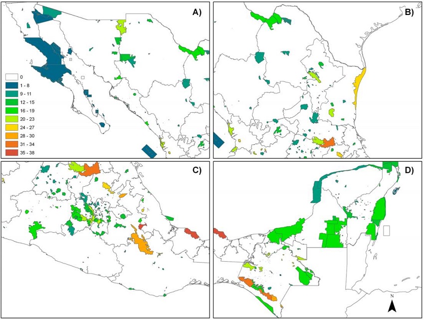 Por otro lado, los datos espaciales de las áreas naturales protegidas de México (divididas en estatales, federales y municipales) que contienen la caracterización de dichas áreas tanto gubernamentales como privadas, se obtuvieron a partir de diferentes fuentes (Bezaury-Creel, Ochoa-Ochoa et al., 2012; Bezaury-Creel, Torres-Origel et al., 2012; Bezaury-Creel, Torres-Origel et al., 2017; Torres-Origel et al., 2012). Es importante mencionar que al momento de decretar un instrumento de conservación, en este caso una ANP gubernamental o privada, es común que existan solapamientos geográficos entre los decretos. Éstos pueden ocasionar que al trabajar con bases de datos espaciales y hacer análisis, se pueden generar sobreestimaciones y generar resultados erróneos (por ejemplo, que se está protegiendo un área mayor a la que corresponde). Para eliminar las áreas duplicadas, se utilizó la jerarquía de las leyes sobre los instrumentos dedicados a la conservación que es muy clara: en primer lugar, van los decretos de áreas naturales protegidas federales sobre las estatales, excepto en los casos de áreas de protección de recursos naturales donde los decretos estatales prevalecen por ley; en segundo lugar, las áreas naturales protegidas estatales prevalecen sobre las municipales en todos los casos; y en tercer lugar, siguiendo la misma lógica, únicamente tomamos en cuenta las iniciativas de protección de la tierra a través de acciones sociales que se ubican fuera de todas las ANP gubernamentales.