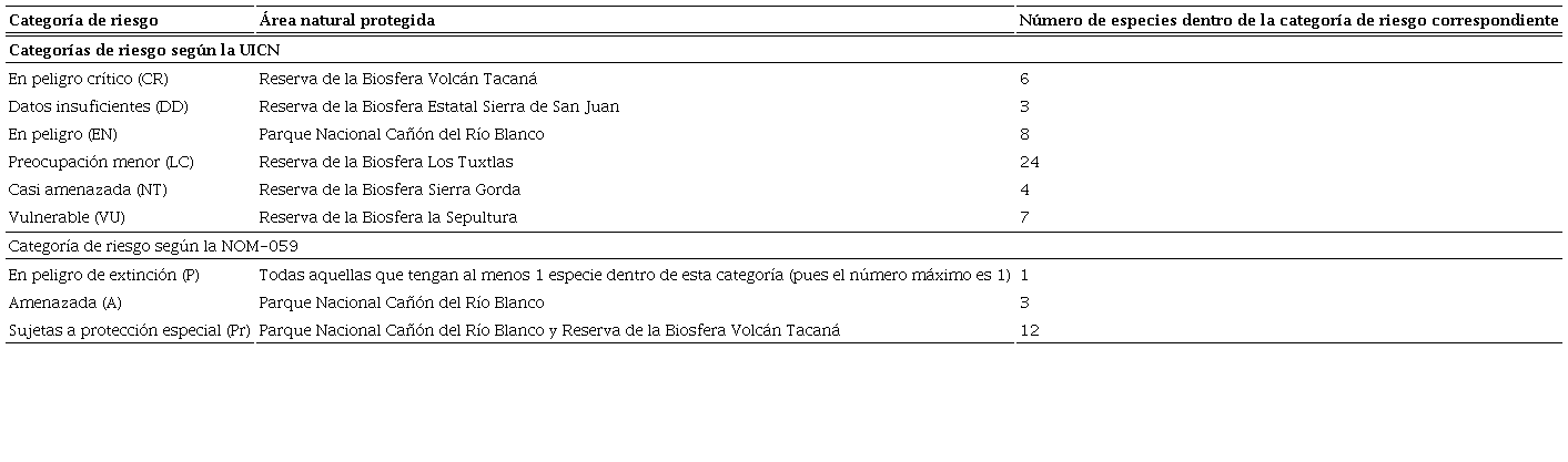 La Reserva de la Biosfera Volcán Tacaná es la ANP con mayor número de especies en riesgo, 18, de acuerdo con la UICN, y 13, de acuerdo a la NOM-059-2010, de las 29 totales que según los análisis están presentes, seguida del Parque Nacional Cañón del Río Blanco con 17 en peligro, de acuerdo a la UICN, y 15 según la NOM-0592010, de las 38 registradas, y en tercer lugar, con 16 especies en riesgo, de acuerdo a la UICN, se encuentran la Reserva de la Biosfera de El Triunfo (con 12 especies en riesgo, según la NOM y 32 especies registradas) y la Reserva Estatal Pico El Loro-Paxtal, con 11 especies en riesgo, según la NOM, y 29 especies registradas. Vale la pena mencionar que estas 2 últimas ANP se encuentran en la sierra Madre de Chiapas y son contiguas. Es importante decir que en este resumen, hecho para poder observar qué ANP tenía más especies en riesgo, se excluyó la categoría de LC (“Least Concern”) de la UICN, pero en la Tabla 1 sí está contabilizada (2020; Tabla 1).
