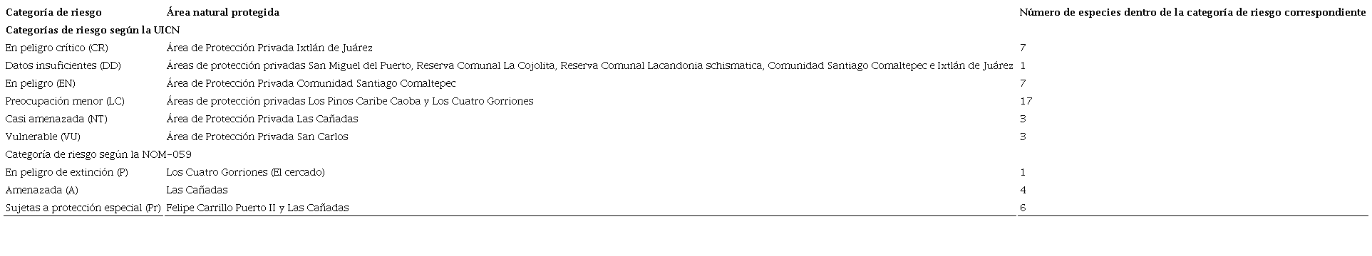Las reservas privadas que tienen mayor número de especies en alguna categoría de riesgo son también las que tienen mayor número de especies, la comunidad Santiago Comaltepec con 18 especies en riesgo según la UICN, seguida de Ixtlán de Juárez con 17 en riesgo y San Juan Bautista Atepec, empatada con Las Cañadas con 11 especies en riesgo según la UICN. Curiosamente, según la NOM-059-2010, es ésta última la que tiene mayor número de especies en riesgo, un total de 11, seguida de la comunidad Santiago Comaltepec e Ixtlán de Juárez, con 7 especies (Tabla 2).