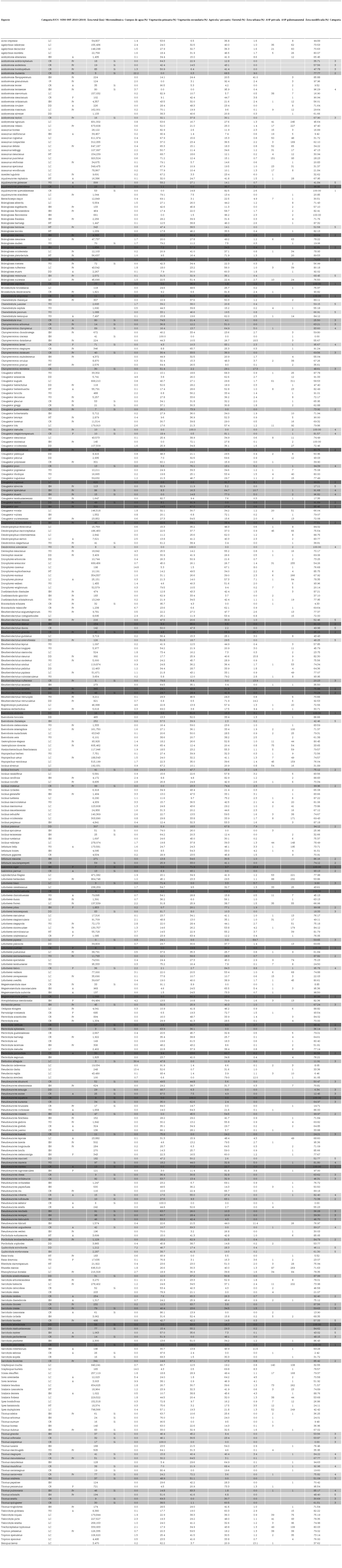 Los datos de distribución de los anfibios de México fueron tomados de la base de datos espacial de la Unión Internacional para la Conservación de la Naturaleza (UICN). Se utilizó dicha fuente de información porque ha sido curada por expertos y es el estándar para las áreas de distribución, además de contener otros datos asociados (UICN, 2020). Dicha base contiene información de la categoría de riesgo asignada para cada especie, así como su información taxonómica y sus áreas de distribución específicas. La información de las categorías de riesgo para México se tomó de la última modificación, en noviembre del 2019, el Anexo Normativo III, que contiene la lista de especies en riesgo de la Norma Oficial Mexicana NOM-059-SEMARNAT-2010 (Semarnat, 2019). Las coberturas, de vegetación y uso de suelo de México (Serie VI; INEGI, 2016) y de división geográfica por estados de México (INEGI, 2019), se obtuvieron a través del portal de geoinformación del Sistema Nacional de Información sobre la Biodiversidad (SNIB) de la Comisión Nacional para el Conocimiento y Uso de la Biodiversidad (Conabio, http://www.conabio.gob.mx/informacion/gis/). Los tipos de vegetación se agruparon en: 1) vegetación primaria, 2) secundaria, 3) agrícola, pecuaria o forestal y 4) área urbana.