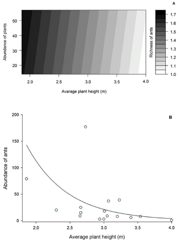Of all the explanatory variables tested, only the interaction of the variables like plant abundance and plant height average per plot affected the ant species richness (Deviance = 2.199, F = 5.013, p = 0.041). In fact, higher ant species richness was observed in plots with greater plant abundance and lower average height of plants (Fig. 1A). We also observed a negative relationship between ant abundance and the height average of plants per plot (Deviance = 7.289, F = 17.860, p = 0.006, Fig. 1B).