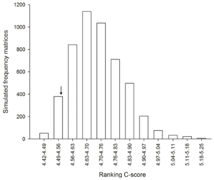 The observed value of co-occurrence index (C-scores) was lower than expected values of simulated matrices, suggesting that the organization of the ant species community does not occur randomly (Fig. 2). Thus, the null hypothesis that predicts that the presence of one ant specie does not interfere in the co-occurrence of another ant species was not corroborated and deterministic processes, such as interspecific interactions, can be responsible for organization of the studied ant community.