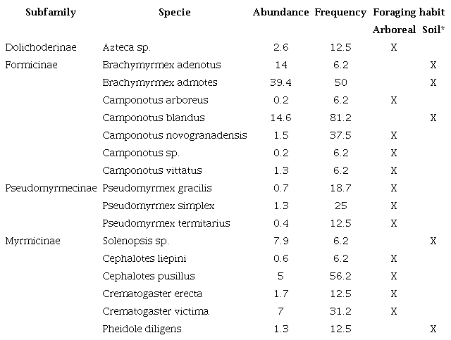 A total of 457 individuals belonging to 17 species and 8 genera of ants (Hymenoptera: Formicidae) were sampled in this study. The most common genus was Camponotus, being represented by 5 species. The most abundant species were Brachymyrmex admotes (39.4%), Camponotus blandus (14.7%) and Brachymyrmex adenotus (14%) while the most frequent species were Camponotus blandus and Cephalotes pusillus, occurring respectively in 81.25% and 56, 25% of the 16 plots (Table 1). We also sampled a total of 472 trees/ shrubs belonging to 46 plant species (Table 2). The more common plant species were Plathymenia reticulata (46 individuals) Erythroxylum suberosum (43 individuals), Eugenia dysenterica (40 individuals) Acosmium dasycarpum (39 individuals). The vegetation had a density of 0.29 plants/ m2 and an average height of 2.94 m.