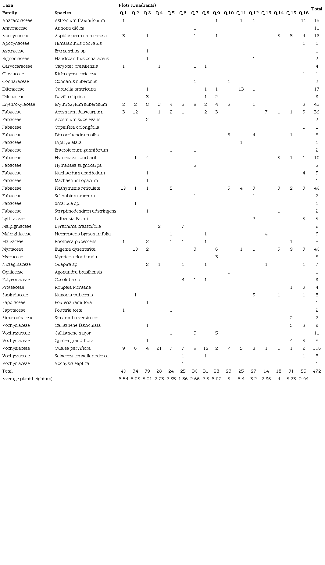 A total of 16 plots of 100 m2 (10 × 10m), distant from each other at least 50 m, were randomly delimited in the study area during January to February 2016. In each plot, all plants with CBH (circumference at breast height) greater than 10 cm were marked with metallic platelets and their CBH and height was determined. Plants samples were collected for identification based on comparisons with botanical collections, herbarium, and by consulting specialists. Thus, the richness, abundance and height average of the plants of each plot were determined and used as measures of environmental heterogeneity (Table 2).