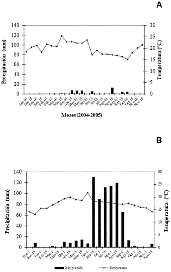 El trabajo de campo se llevó a cabo entre diciembre de 2004 y noviembre de 2005, en 2 sitios del centro de México cuya vegetación dominante es matorral xerófilo, con el fin de conocer la variación espacial en los rasgos poblacionales y la biología de este insecto: Zapotitlán Salinas (denominado en lo sucesivo como Zapotitlán), localizado en la parte suroccidental del valle de Tehuacán, Puebla (18°19’ N, 97°27’ O; 1,480 m snm), y la Reserva Ecológica del Pedregal de San Ángel de Ciudad Universitaria (que en lo sucesivo se le denominará Pedregal), localizada al centro-poniente de la Ciudad de México (19°17’ N, 99°11’ O; 2,250 m snm). Zapotitlán presenta un clima seco con lluvias en verano, una temperatura media anual de 21.2 °C y una precipitación de 380 mm (Arias et al., 2001; fig. 1a); mientras que el Pedregal presenta un clima templado subhúmedo con lluvias en verano, con una temperatura media anual de 16.1°C y precipitación anual de 835 mm (César-García, 2002; fig. 1b). La elección de los sitios fue hecha debido a que se había registrado la presencia de grillos de este género en ambas localidades, en Zapotitlán por Ponce-Wainer y Cueva del Castillo (2008) y en el Pedregal, por Cano-Santana y Oyama (1992). El objetivo de comparar los 2 sitios fue conocer la biología de los grillos, ya que las localidades estudiadas fueron diferentes entre sí.