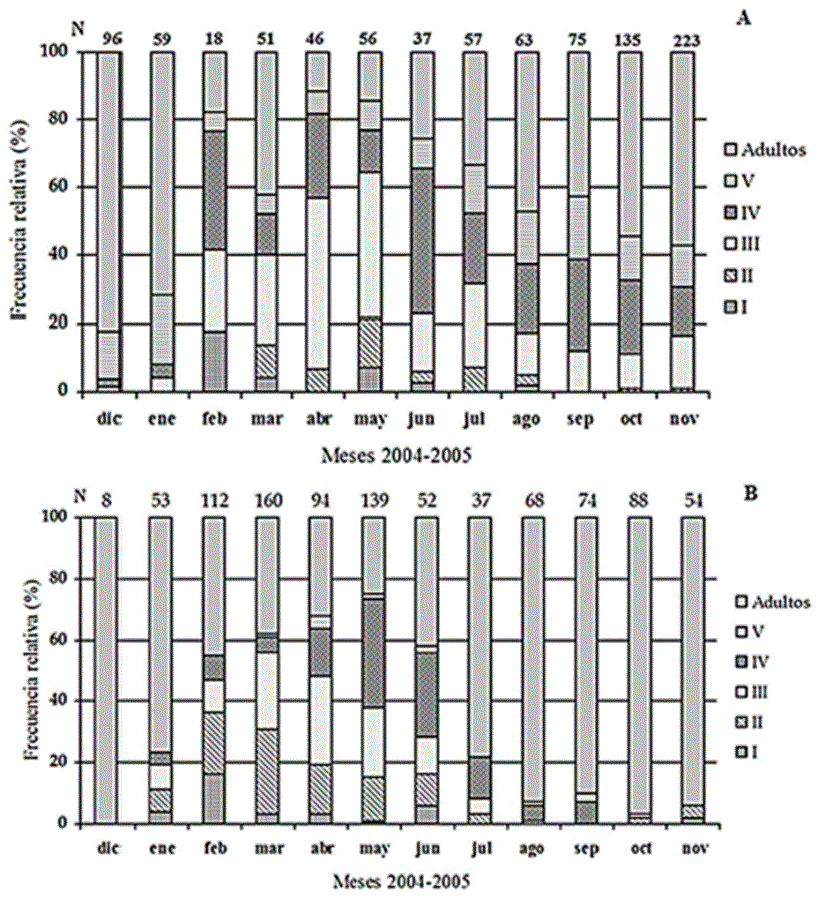 La especie registró 5 estadios ninfales, en ambas localidades (fig. 2a, b). Se contabilizaron en los muestreos 916 ejemplares de O. fultoni en Zapotitlán y 939 ejemplares en el Pedregal. En Zapotitlán, las ninfas del estadio I fueron registradas en febrero-junio y agosto, y las del estadio II de marzo a agosto (fig. 2a), pero las ninfas de los estadios III, IV y V, así como los adultos, fueron registrados todo el año. En diciembre, los adultos representaron 84.1% de la población, mientras que en abril representaban 15.2%. El mayor número de ninfas y adultos fue registrado en noviembre (96 y 127 individuos, respectivamente), en tanto que el número más bajo de ninfas fue registrado en enero y febrero (14 individuos en cada mes) y la abundancia más baja de adultos fue registrada en febrero (4 individuos).