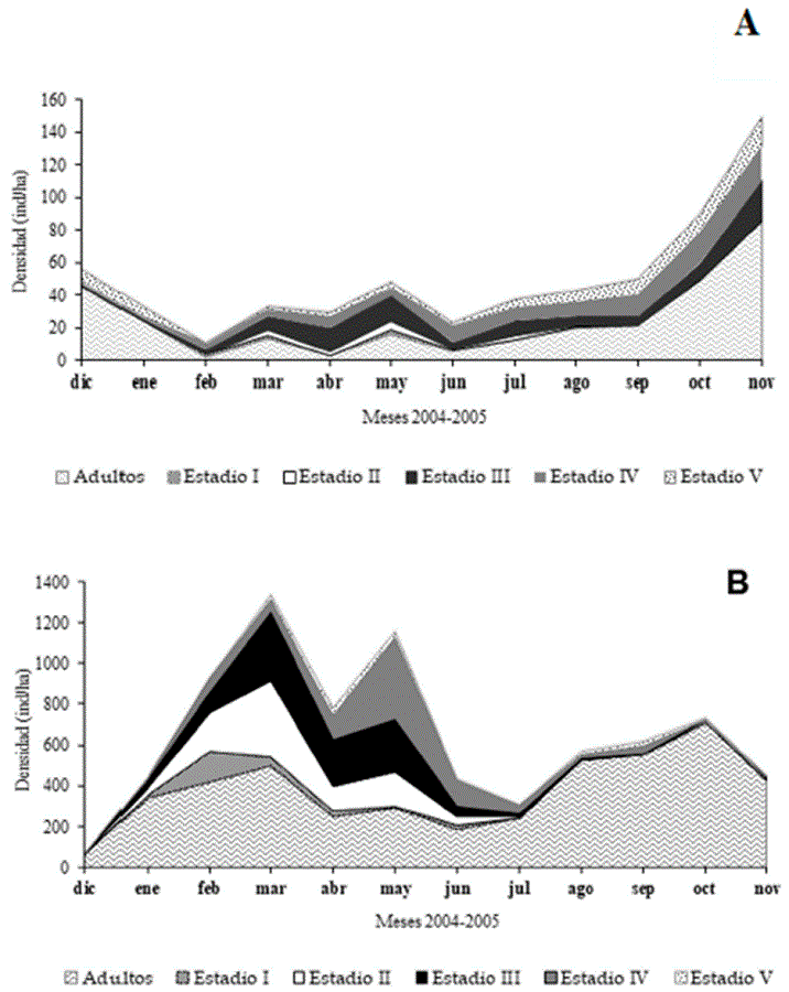 La densidad promedio anual de grillos fue más alta en el Pedregal (652.0 ± 0.2 ind./ha) que en Zapotitlán (50.4 ± 0.2 ind./ha). La densidad más alta fue registrada en noviembre en Zapotitlán (149.3 ind/ha) y en marzo en el Pedregal (1,333.3 ind./ha). La densidad más baja en Zapotitlán fue registrada en febrero (11.4 ind./ha) y en diciembre en el Pedregal (66.7 ind./ha). En ambas localidades, los adultos se encontraron durante todo el año (fig. 3a, b). En Zapotitlán los adultos registraron valores altos de densidad entre octubre y diciembre (de 46.0 a 85.3 ind./ha) (fig. 3a); mientras que en el Pedregal, la densidad alcanzó valores de entre 525.0 y 708.3 ind./ha entre agosto y octubre (fig. 3b)