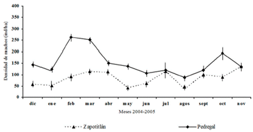 La densidad de machos se afectó significativamente por el sitio (F1,352 = 151.63, p < 0.001), la fecha (F10,352 = 3.40, p = 0.032) y la interacción sitio × fecha (F10,352 = 3.97, p < 0.001). La prueba de comparación múltiple de medias de Tukey mostró que en Zapotitlán se registró la densidad más baja de machos, con 45.52 ± error estándar 10.5 ind./ha en agosto y la más alta en noviembre, con 125 ± 9.3 machos/ha (fig. 4). En el Pedregal la densidad más alta fue registrada en febrero (255 ± 10.2 machos/ha), luego en marzo (250 ± 9.5 machos/ha) y finalmente, en octubre (200 ± 11.3 machos/ha) (fig. 4). En Zapotitlán se registró una densidad promedio anual menor de machos (83.41 ± 5.3 ind./ha) que en el Pedregal (153.75 ± 9.1 ind./ha).