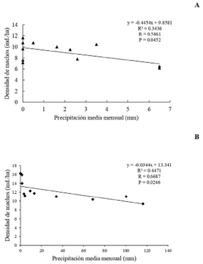 En ambas localidades se encontró una correlación negativa y significativa entre la precipitación acumulada mensual y la densidad de machos (Zapotitlán: r = -0.586, g.l. = 10, p = 0.045; fig. 5a; Pedregal: r = -0.669, g.l. = 9, p = 0.025; fig. 5b). En contraste, no se encontró correlación significativa entre la temperatura media mensual y la densidad de machos (Zapotitlán: r = 0.147, g.l. = 10, p = 0.646; Pedregal: r = 0.221, g.l. = 9, p = 0.553).