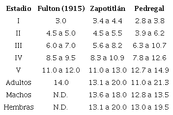 Para conocer los estados de desarrollo de O. fultoni en las parcelas de muestreo, cada grillo fue marcado en el pronoto con pintura blanca y se registró la longitud corporal de cada ejemplar recolectado, desde el vertex cefálico hasta el extremo terminal del abdomen. La estructura de edades se estableció siguiendo la categorización propuesta por Fulton (1915), misma que fue estandarizada en los trabajos de Pérez-Escobedo (2007) y Romero-Mata (2008) para 5 estadios ninfales y 2 sexos en adultos. Con los datos procedentes de las búsquedas y los conteos en las parcelas, se realizó una extrapolación de la densidad promedio anual de grillos por hectárea, debido a que el número y tamaño de las parcelas fue diferente entre sitios.