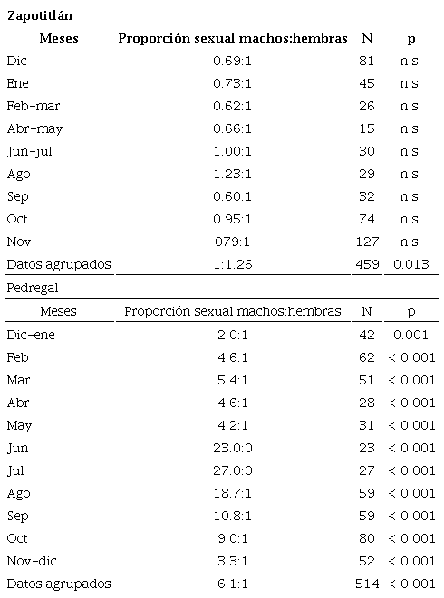 En Zapotitlán, la proporción sexual de la población de O. fultoni no difirió de 1:1 a lo largo de los meses (p > 0.05); no obstante, la proporción sexual calculada con los datos agrupados difirió significativamente de 1:1, pues se registró un macho por 1.2 hembras (N = 459; χ2 = 6.12, g.l. = 1, p < 0.05; tabla 2). En contraste, en la población del Pedregal, la proporción de machos siempre fue significativamente más alta que la de las hembras a lo largo del año (p < 0.001), incluso en junio y julio, no se registraron hembras (tabla 2). Al agrupar los datos de este sitio se encontró que se registran 6.1 machos por hembra (N = 514; χ2 = 266.342, g.l. = 1, p < 0.001).
