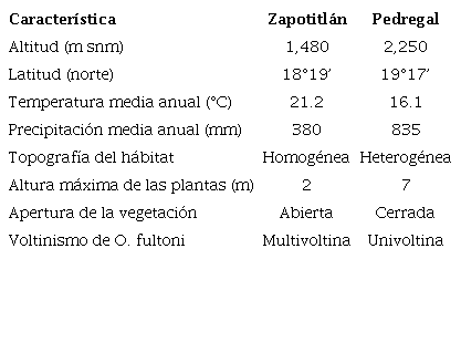 En la población de Zapotitlán se registraron ninfas de los 5 estadios a lo largo de todo el año, lo cual es un indicio que ésta presenta conducta multivoltina (figs. 2a y 3a). En contraste, en el Pedregal la presencia de las ninfas se concentró específicamente en los meses secos del año (de febrero a junio) lo que indica que la población es univoltina (figs. 2b y 3b). Esta diferencia se atribuye a que Zapotitlán es un sitio localizado a menor altitud (820 m) y menor latitud que el Pedregal, lo cual determina que en Zapotitlán haya una temperatura media anual más alta (tabla 3), lo cual podría permitir a estos grillos a mantener un gran número de generaciones traslapadas durante el año. Nuestros resultados respaldan las observaciones que Alexander (1968) realizó en Canadá y EUA para esta misma especie, quien encontró que las poblaciones de O. fultoni que viven más al sur presentan 2 o 3 generaciones al año, mientras aquellas que están en el norte presentan solamente una. Nuestros resultados indican que O. fultoni registró una abundancia contrastante en los 2 sitios con vegetación xerofítica del centro de México. Los registros diurnos correspondientes a Zapotitlán indican abundancia por decenas de ejemplares, en tanto que en el Pedregal, los conteos nocturnos indican una abundancia contabilizada en cientos de ejemplares y con adultos de mayor talla (tabla 1). Estas diferencias de abundancia y tamaño corporal, se atribuyen a que el hábitat que ofrece el Pedregal es altamente productivo (636 g m-2 año-1 de productividad primaria neta aérea; Cano-Santana, 1994) y con una alta diversidad de plantas arbustivas y arbóreas hospederas de relativa mayor talla (3-7 m) (Pérez-Escobedo, 2007), en tanto que el hábitat que ofrece Zapotitlán evidentemente es menos productivo dadas las condiciones áridas prevalecientes y su menor diversidad vegetal, asociada a que la zona de Barranca Grande presenta una topografía homogénea (tabla 3) y está dominada por plantas de talla pequeña (< 2.0 m), como W. urens y A. cochliacantha (Romero-Mata, 2008, 2018).