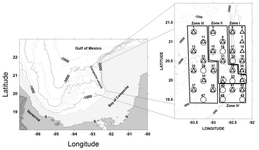 Two oceanographic cruises were conducted aboard R/V Justo Sierra owned by the National Autonomous University of Mexico (UNAM) from February 21-28, 2011 (mid-winter or northern storm season), and from October 4-12, 2012 (end of summer, the start of the winter or northern storm season). Campeche Canyon was divided into 4 zones based on canyon bathymetry and hydrography. Stations 5, 6, 7, 17, 18, 19, 20, and 30 were in zone I, which is on the continental slope with a steep drop and the influence of the Loop Current. Zone II corresponds to the axis and head of the canyon where hydrodynamic processes occur (anticyclonic-cyclonic eddy and hydraulic jump); stations 3, 9, 15, 16, 21, 29, 31, 32, and 33 were located here. Zone III, with anticyclonic-cyclonic eddy and a thermal front, encompasses the western part of the canyon; here, stations 1, 11, 13, 23, 25, 26, 27, 35, 37, 39, and 47 were located. Finally, zone IV corresponds to the southern part near the continental shelf with shallow depths and included stations 40, 41, 42, 43, and 45 (Fig. 1).