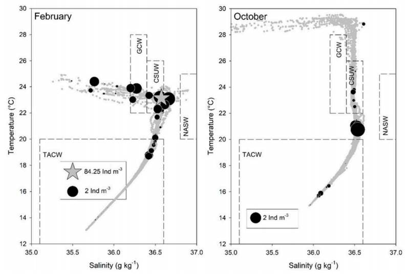 Four water masses were evidenced by temperaturesalinity (T-S) diagrams and according to the classification of Durán-Campos et al. (2017) and Portela et al. (2018): 1) Tropical Atlantic Central Water characterized by 8 < T < 20 ºC and 35.1 < S < 36.6 g kg-1, 2) Gulf Common Water characterized by 22 < T < 28 °C), and absolute salinity of 36.2 < S < 36.4 g kg-1, 3) Caribbean Subtropical Underwater with 22 < T < 26 °C), and absolute salinity of 36.4 < S < 36.6 g kg-1, and 4) North Atlantic Subtropical Underwater characterized by 20 < T < 25 ºC and absolute salinity of > 36.8 g kg-1. The last 2 occurred in the top 150 m of the water column. The highest abundances were found in the waters of the Caribbean Subtropical Underwater in February (Fig. 10).