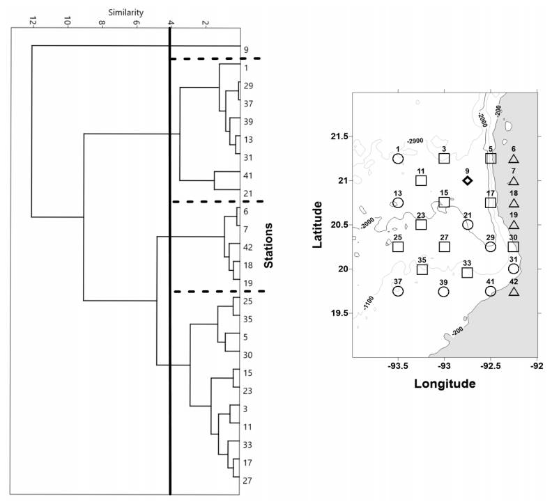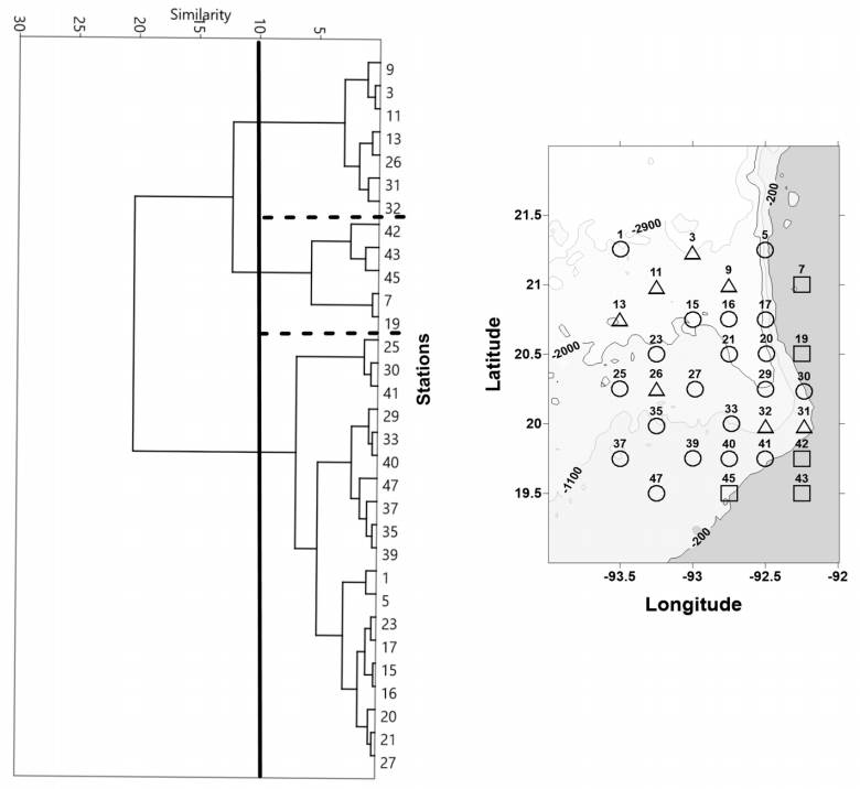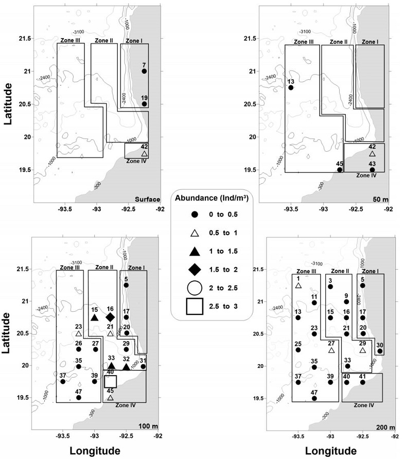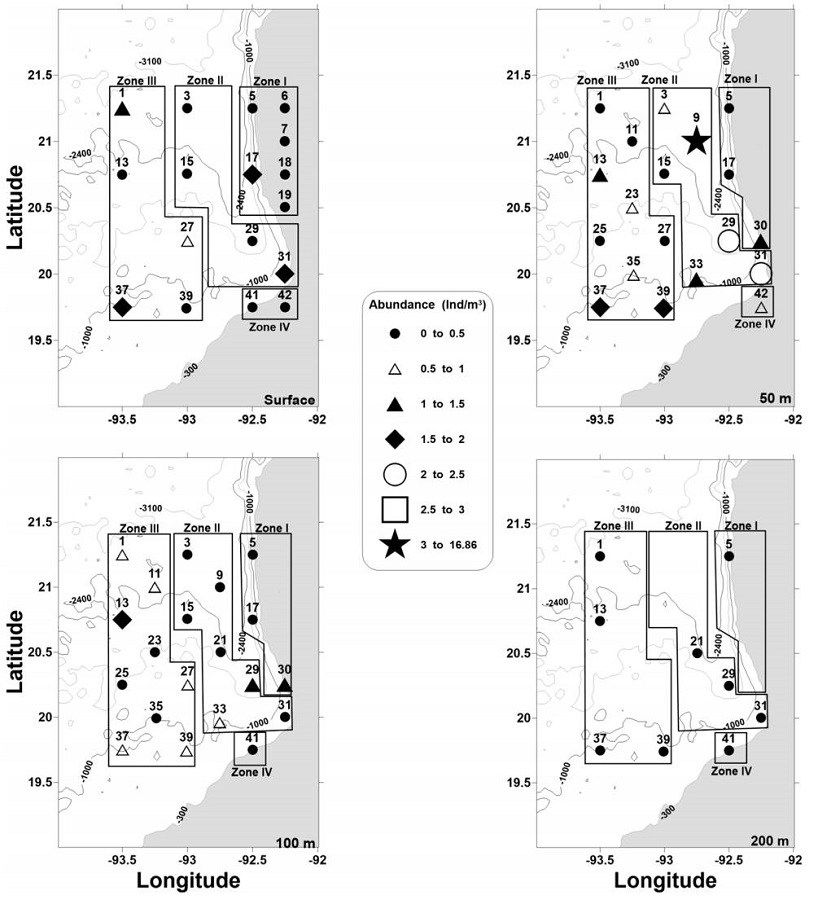 The second group consisted of 7 stations, which were mainly sampled during the day (57%) located in zones II and III. The mean abundance was 0.434 Ind m-3, and the mean diversity was 1,147 bits Ind-1. Finally, group 3 consisted of 5 stations, of which 60% were night samplings and were located on the continental shelf of zones I and IV. This group showed lower mean abundance and diversity (0.230 Ind m-3, 0.254 bits Ind-1) and higher Chl-a and salinities (26.3 °C, 0.360 mg m-3, and 36.50 g kg-1) than those of the other 2 groups.