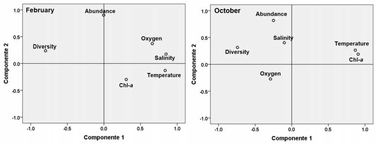 From the principal component analysis (PCA), in February, temperature and dissolved oxygen had the highest effect on variance; the first principal component had large positive associations with temperature and salinity, followed by dissolved oxygen. The second component had positive associations with oxygen and negative associations with Chl-a and temperature. The abundance presented an association of almost zero with the first component and a high positive association with the second component; diversity showed a high negative association with component 1 and a low positive association with component 2. (Fig. 13). Temperature and dissolved oxygen primarily influenced variance in both February and October. The second component had a negative association with oxygen and a positive association with salinity. In this sampling, abundance presented a low negative association with the first component and a high positive association with the second component; diversity showed a high negative association with component 1 and a low positive association with component 2 (Fig. 13).