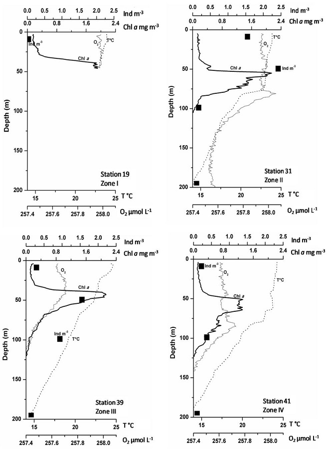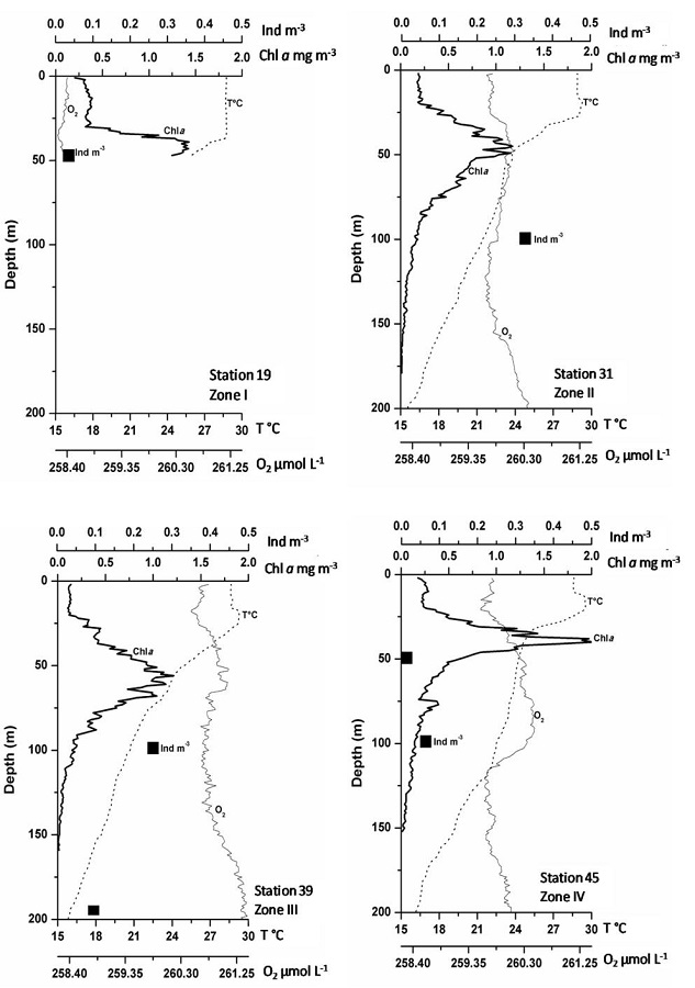 Regarding Chl-a concentrations, it was observed that in February, the highest abundance of euphausiids was above and below the deep chlorophyll maxima that were rather narrow and located above the thermocline at approximately 70 m depth (Fig. 4). In October, the highest euphausiid abundance was recorded below the deep chlorophyll maxima, located at approximately 50 m depth below the thermocline and was wider than those found in February (Fig. 5).