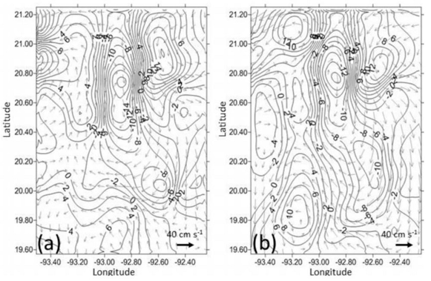 The vertical component of the relative vorticity was obtained by numerically solving the vertical component of the rotational velocity as described by Santiago-Arce and Salas-de-León (2012), while the geostrophic currents were obtained as described by Salas-de Léon et al. (1992).