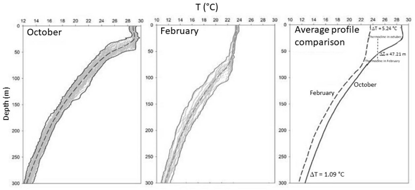 Euphausiids and their relationship with hydrodynamic processes. In February, a deep mixed layer with a deep thermocline was observed (approximately at 80 m depth), while in October, the water column was stratified, and the thermocline was located at a depth of 50 m (Figs. 4, 5). Temperature in February was lower (24.44 °C) than that in October (29.09 °C). This suggests that temperature was one of the main drivers of euphausiid distributions; in both sampling periods, the highest abundance was recorded at temperatures between 15 and 22 °C, and euphausiids were mostly located at the lower levels (100 and 200 m) in October and from the surface to 200 m in February (Figs. 2, 3).