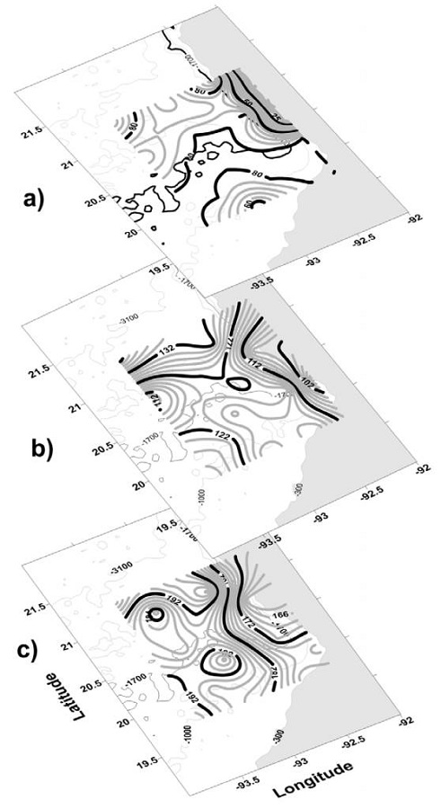 The eddies in the Campeche Canyon are hydrodynamic processes that influence the resuspension of organic matter and may lead to increased food availability and, therefore, increased euphausiid abundances. These eddies favor the development of phytoplankton and trophic webs in marine ecosystems (Mann & Lazier, 1991).