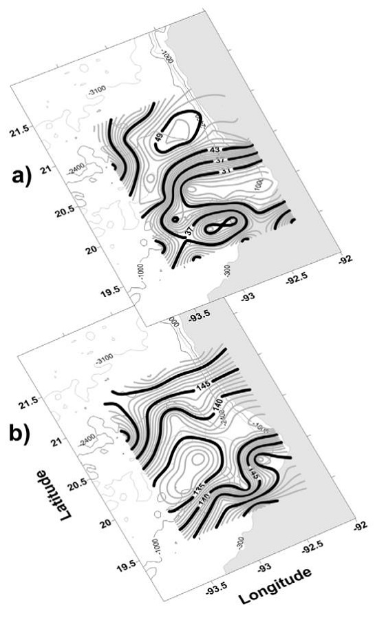 From October to April, the Gulf of Mexico is subject to strong winds from the north (winter storms or northern cold fronts, which are locally called “Nortes”). In summer, tropical storms often develop into hurricanes with winds of more than 120 km h-1 (Monreal-Gómez & Salas-de León, 1990). The Loop Current influences the circulation and water masses of the Gulf of Mexico, including the Yucatán shelf, Campeche Bank, Bay of Campeche, and Campeche Canyon (Díaz-Flores et al., 2017). This current regulates the formation of anticyclonic eddies and presents its maximum flow in the months of AprilMay until August when its greatest intrusion also occurs. Later, when the current loses strength, it begins to strangle and forms anticyclonic eddies that are accompanied by cyclonic meanders from which cold cyclonic eddies are formed (Vukovich & Maul, 1985). Cyclonic eddies significantly influence local production by transporting nutrients from the deep layers to the surface layer (Díaz-Flores et al., 2017; Salas-de León et al., 2004). Salas-de León et al. (2004) showed the existence of subsurface cyclonic and anticyclonic eddies in the Campeche Canyon in the summer of 1999. The eddies were clearer below the mixed layer (-40 m deep) and their influence extended to a depth of 300 m. Increasing the temperature, salinity, and dissolved oxygen isoclines in the southeast of the canyon suggests the existence of colder and nutrientrich intermediate upwelled waters near the surface. The subsurface anticyclonic eddy induced convergence of water over the Campeche Canyon, while the cyclonic eddy produced a divergence, presenting a well-delimited frontal region between the 2 eddies.