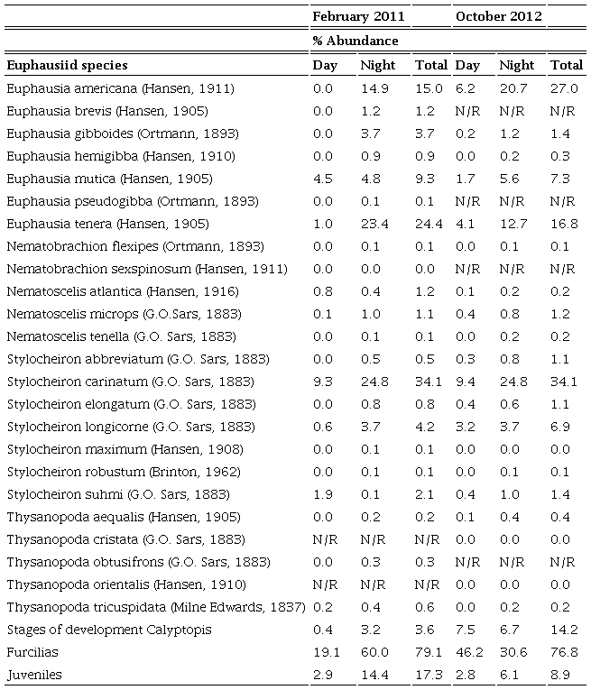 Regarding larval stages, calyptosis, furciliae, and juveniles were found in both February and October. The furcilia stage had the greatest abundance in the 4 levels sampled in the water column in both months, especially in zones II and III. The relative abundance of the larval stages (88.3% in February and 72.6% in October) was higher than that in the adults (11.7% in February and 27.4% in October).