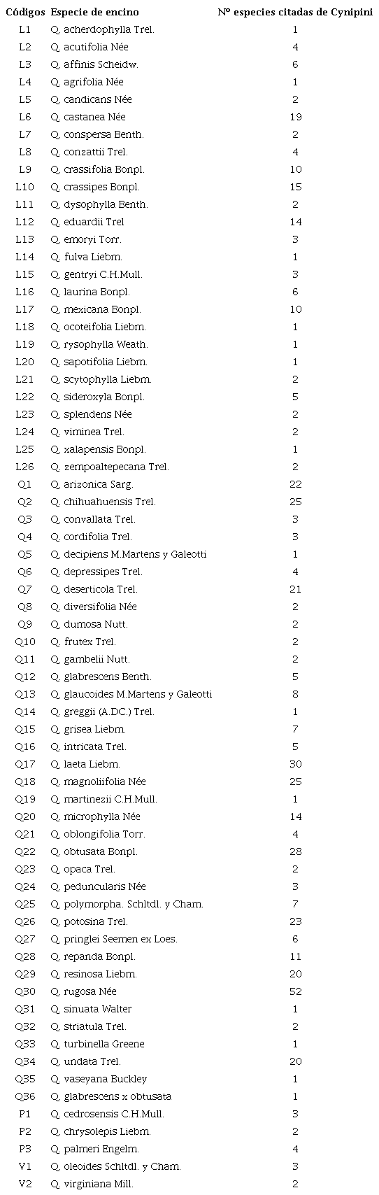 Para cada especie gallícola se menciona el tipo de generación que representa (sexual o agámica). Para los hospedadores (Quercus ssp.) se menciona siempre la especie de encino que figura originalmente en el trabajo consultado y el nombre actual en el caso de que fuera un sinónimo. Con el fin de verificar las especies válidas de Quercus, ha sido consultada la página "Oaks of the World" (Hélardot, 2020). En lo que se refiere a la presencia o no de una cita de Quercus en un estado determinado, se ha consultado el estudio de Valencia (2004). Cada dato extraído se acompaña de la página de donde se encuentra el dato bibliográfico.