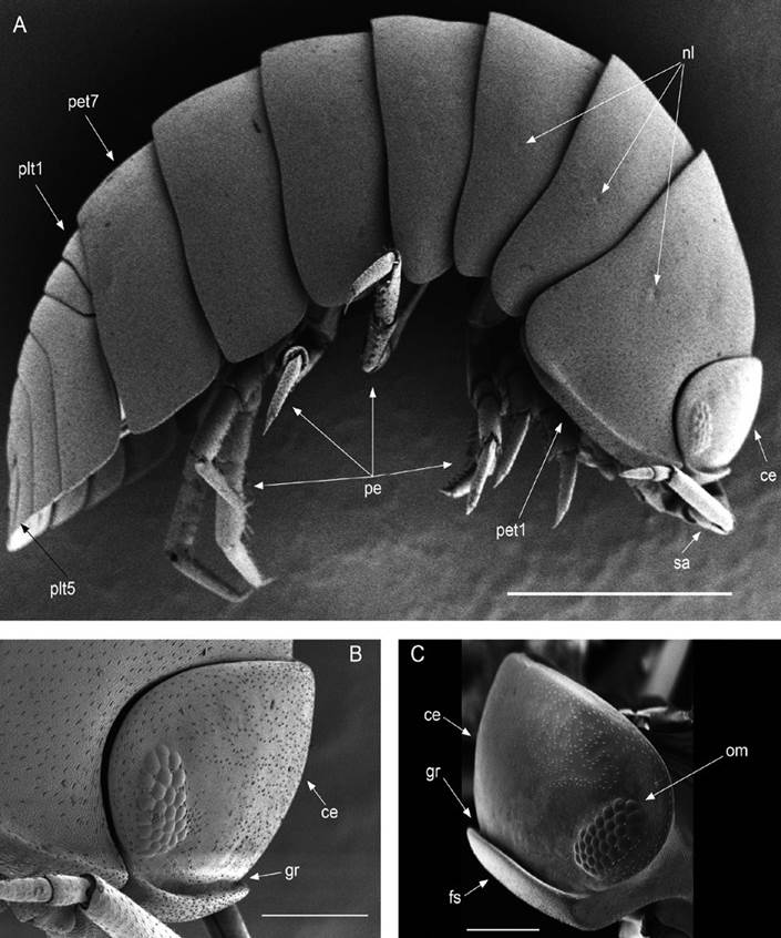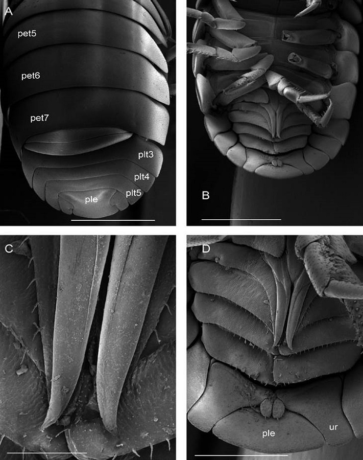To María Luisa Jiménez Jiménez and Carlos Palacios Cardiel, Laboratorio de Aracnología y Entomología, CIB, for the donation of isopod material, and to Aurora Cristina González Pedraza, and Juan Antonio García Oviedo, Laboratorio de Ecología, Escuela Nacional de Ciencias Biológicas, Instituto Politécnico Nacional, Ciudad de México, for their permission to study the oniscidean collection. Special thanks to Ariel A. Cruz Villacorta, Laboratorio de Microscopía Electrónica, CIB, and Araceli Adabache Ortiz, Laboratorio Institucional de Microscopía Electrónica, Universidad Autónoma de Aguascalientes for their expert assistance in the SEM analyses. Also, to Marcelo Silva Briano for his kind support to carry out the SEM study at UAA. Many thanks to Gerardo Rafael Hernández García, Departamento de Extensión y Divulgación Científica, CIB, for editing SEM plates, cladogram, and map. We thank José Ángel Camacho Durán for his help in field work. Field collection permit was given by the Secretaría de Medio Ambiente y Recursos Naturales (SGPA/DGVS/01059/16). Ilse E. Segura-Zarzosa received a doctoral fellowship from Consejo Nacional de Ciencia y Tecnología (No. 551538).