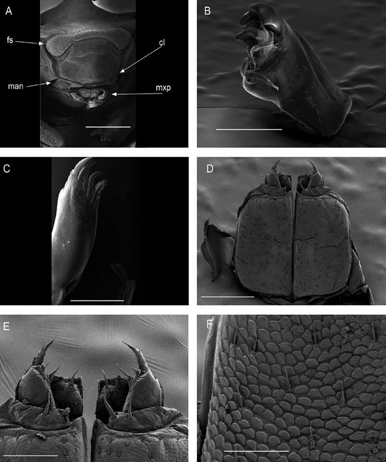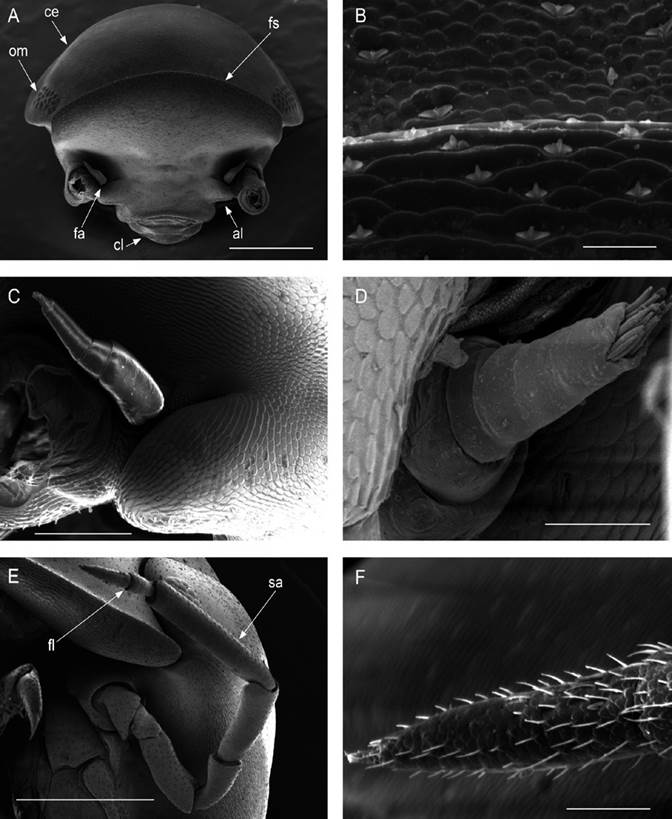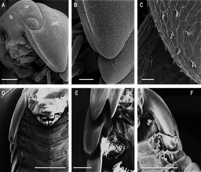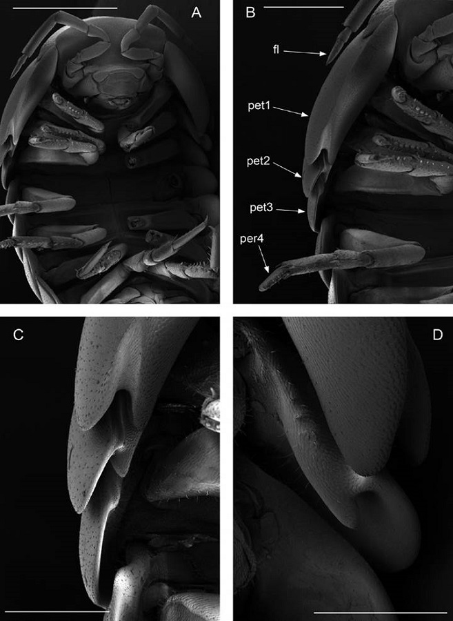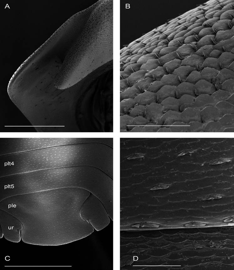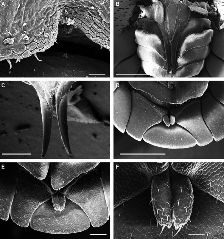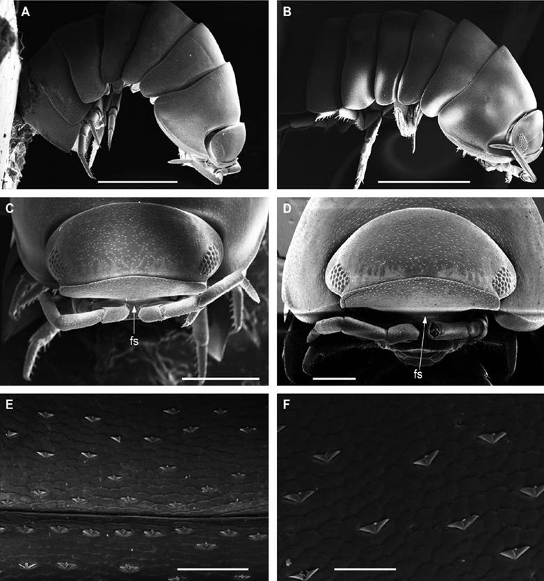 Description. Habitus, measurements and color as described in Diagnosis (Fig. 1A). Dorsal surface of cephalothorax and tergites glossy, without tubercles, covered with semi-curved scales and scattered tricorn scales (Figs. 2E-F, 3B). Pair of small noduli laterales on each pereion-tergite 1-7 all at same distance to lateral margin near posterior border of tergites (Fig. 1A). Cephalothorax compressed antero-posteriorly, 2 times as wide as long, vertex convex in the middle (Figs. 1B-C, 2C-D). Complex eyes situated laterally, halfway between frontal and caudal margins, each with 23-27 ommatidia normally distributed in 4 rows (Figs. 1B-C, 2C-D). Frontal shield (lamina frontalis) covered by semi-curved scales with scattered tricorn scales (Figs. 2E-F, 3B), trapezoid in frontal view with proximal lateral antennal lobes for holding the proximal portion of the second antenna during conglobation; posterior margin expanded, remaining a groove behind the frontal shield (Figs. 1A-C, 2A-D). First antenna 3-jointed with aesthetascs on distal article, basal article longest and broadest (Fig. 3C-D). Second antennae with first article short, second about 3 times as long as first, third and fourth subequal and each a little shorter than second, fifth about 1.5 times longer than fourth (Fig. 3E). Flagellum 2-jointed, second article lanceolate with apical cone, about 2 times longer than first; complete flagellum about 1/2 length of fifth article (Fig. 3F). Clypeus with anterior margin straight, posterior margin convex (Fig. 4A). Right mandible with pars incisive with 3 round projections, central one largest, lacinia mobilis composed by 2 cusps with short lightly rounded portion, pars molaris with tuft of plumose setae. Left mandible with pars incisive with 3 crown shaped projections, central one largest, lacinia mobilis short with irregular cusp with basal hairy lobe, pars molaris composed by tuft of plumose hairy setae, external surface of mandibles with rounded and lanceolate scales (Fig. 4B). Labium with 4 lobes, medial lobes small, lateral lobes larger (Fig. 5A-B). First maxilla outer endite with outer group of 4 stout teeth, and inner group of 6 slender teeth (Figs. 4C, 5C-D, F); inner endite with 2 penicils (Fig. 5C, E), external margin with row of short setae (Fig. 5C). Second maxilla membranous and laminate (Fig. 5G), inner lobe smaller, covered by abundant short setae, outer lobe wide, rounded, covered by pubescence. Maxilliped palp with 3 articles (Fig. 4D-E); basal article bearing 2 large setae; medial article with 1 large proximal seta and 1 small apical seta, distal article with an apical seta (Fig. 4E); ventral surface covered by semi-curved scales with lanceolate scales (Fig. 4F). Pereion-tergite 1 with notch (schisma) along 1/4 of the epimeron at the posterior corner (Figs. 6A-D, 8C, 11A) into which the anterior corner of the pereion-tergite 2 epimeron fits when the animal conglobates (Fig. 7A-F). Pereion-tergite 2 with large digitiform lobe on anterior ventral side (Fig. 6C-D). Pereion-tergite 3 with low protuberance on anterior ventral side (Fig. 6C, D). Pereiopod 1 with antennal brush composed by a groove covered by transversal scales on 2/3 of anterior side of carpus and basal part of propodus (Figs. 8B, 9A-D), inner side of merus, carpus and propodus with spines (Fig. 8A-D). Sternite 7 with medial process apically bilobate covering proximal portion of genital papilla (Fig. 12D). Pleon-tergites (pleon-segments) 1 and 2 with lateral parts undeveloped, covered laterally by pereion-tergite 7 (Figs. 1A, 10A). Pleon-tergites 3-5 broadly expanded laterally, lateral margins forming continuous line with lateral margins of pereion-tergites (Figs. 1A, 10A-B). Male genital papilla with ventral shield lanceolate (Figs. 13B, 12A, C). Pleopod 1 endopodite (copulatory appendage) elongated with acute apex (Figs. 10B-D, 12A, 13C), exopodite trapezoid with perispiracular area (Figs. 12C, F, 13A). Pleotelson wide at base, becoming constricted about the middle, expanding posteriorly to a truncate caudal margin (Figs. 11C, 14A, C, 15B, C-E), external surface covered by rounded scales and scattered tricorn scales (Figs. 11D, 14B). Uropod sympodites enlarged, flattened about twice as wide as long, filling space between caudal side of pleon-tergite 5 and lateral side of pleotelson (Figs. 10D, 11C, 12A-B, 13D-E, 14A, C-D, 15B-D); exopodites inserted on medial margin of sympodites, about halfway between anterior and caudal margins (Figs. 14C, E, 15F); endopodites inserted on anteromedial margin of sympodites not visible in dorsal view, elongated, flattened, distally rounded, covered by semirounded scales and lanceolate scales, apex with curved spine, extending one third length of pleotelson, their bases are covered by an extension of the anteromedial margin of the sympodite (Figs. 10D, 13D-F, 15A).