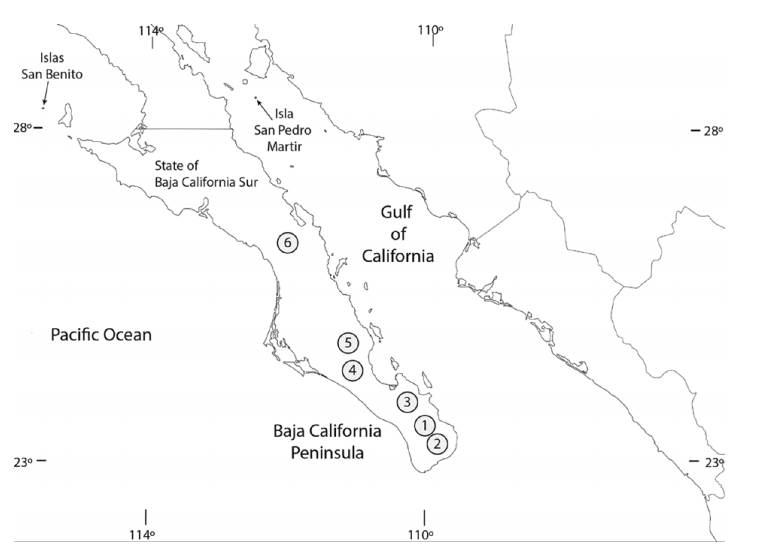 Phytogeographically, it is located in the Central Gulf Coast of the Sonoran Desert Region with sarcocaulescent plants with Ashy Limberbush (Jatropha cinerea), Palo Blanco (Lysiloma candidum), the Elephant Cactus or Cardón (Pachycereus pringlei), and the native palms Brahea brandegeei and Washingtonia robusta, as the most relevant species (Garcillán et al., 2012). No additional oniscidean species were recorded in this site. 4) Las Pocitas, El Pilar, La Paz. The site is in the El Pilar creek. It belongs to Las Pocitas-San Hilario basin whose drainage ends in the Pacific slope in the western coast of the BCP. The oasis has permanent springs surrounded by typical riparian vegetation of the southern BCP. Phytogeographically it is located in the Magdalena Plains of the Sonoran Desert Region with desert trees like the Western Honey Mesquite (Prosopis glandulosa), Adam’s tree (Fouquieria diguetii), Peninsular Palo Verde (Parkinsonia florida), the Elephant Cactus or Cardón (Pachycereus pringlei), Galloping Cactus (Stenocereus gummosus), the native palms Brahea brandegeei and Washingtonia robusta, and exotic Date palms (Phoenix dactylifera) as the most relevant species (Garcillán et al., 2012). Specimens of Porcellionides pruinosus were collected from this site (Segura-Zarzosa et al., 2020). 5) San Pedro de la Presa, La Paz. The site is in the Las Ánimas creek. It belongs to the Santa Rita basin whose drainage ends in the Pacific slope in the western coast of the BCP. This oasis has large permanent springs surrounded by a forest of native (Brahea brandegeei and Washingtonia robusta) and exotic Date palms (Phoenix dactylifera) as the most relevant species. Phytogeographically it is located in the Magdalena Plains of the Sonoran Desert Region (Garcillán et al., 2012). Specimens of Porcellionides pruinosus were collected from this site (Segura-Zarzosa et al., 2020). 6) Carambuche, La Purísima, Comondú. The site is in the La Purísima creek. It belongs to La Purísima basin whose drainage ends in the Pacific slope in the western coast of the BCP. This oasis has permanent springs surrounded by typical riparian vegetation of southern BCP with native (Brahea brandegeei and Washingtonia robusta) and exotic Date palms (Phoenix dactylifera) as the most relevant species. Phytogeographically it is located in the Sonoran Desert in the border between the Magdalena Plains and the Vizcaíno Desert ecological regions (Garcillán et al., 2012). Specimens of Porcellionides pruinosus were collected from this site (Segura-Zarzosa et al., 2020).