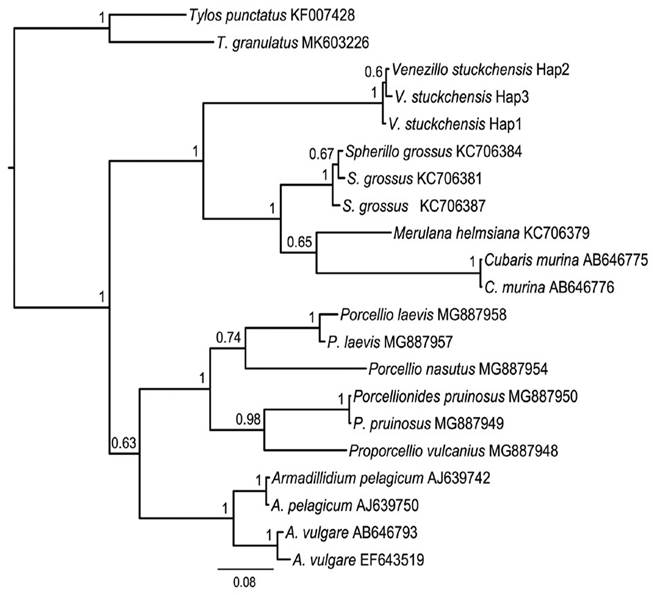 Haplotypic identity. From the 439 bp 16S sequences of V. stuckchensis, 3 haplotypes were identified. Their uncorrected pairwise genetic distances ranged from 0.68 to 1.14%. These sequences are the first deposited in the GenBank for the genus Venezillo (Table 1); therefore it was not possible to compare them with other congeneric species. The Bayesian phylogenetic analysis with the best fit nucleotide substitution model TIM2+I+G for the dataset containing 404 characters showed that V. stuckchensis formed a monophyletic clade with the 3 species of Armadillidae which was well-supported by posterior probability, confirming its place within this family. The node separating the species of Armadillidae from species of the other 2 families, Armadillidiidae and Porcellionidae, was also well supported (Fig. 17). The closer phylogenetic relationship between the Armadillidiidae and Porcellionidae, separated from the Armadillidae has been already reported in molecular phylogenetic studies using the mitochondrial large subunit rRNA gene (Michel-Salzata & Bouchona, 2000), and the nuclear 18S and 28S, and mitochondrial COI genes (Lins et al., 2017).
