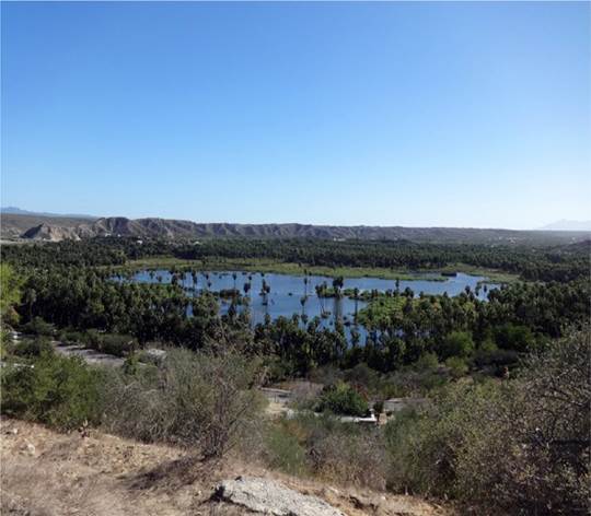Distribution and habitat remarks. The distribution of the species covers a maximum lineal distance of about 450 km in the state of Baja California Sur, from the southernmost site in El Chorro, Agua Caliente to the northernmost site in Carambuche, La Purísima (Fig. 16). Oniscidean samples collected from wetlands located just to the south (oasis Estero San José del Cabo) and to the north (oasis San Ignacio) of this area contained specimens of the exotic Porcellio laevisLatreille, 1804, and Porcellionides pruinosus (Brandt, 1833) (Segura-Zarzosa et al., 2020). We report populations of Venezillo stuckchensis from 6 wetlands which are distributed in the southern part of the BCP. The characteristics of these wetlands are as follows, from south to north: 1) El Chorro, Agua Caliente, Los Cabos. This oasis belongs to the Santiago basin whose drainage ends in the Gulf of California (Mar de Cortés). It is located in the Agua Caliente creek with a permanent hot spring. Phytogeographically, it is in the Cape Lowland Tropical Region surrounded by typical riparian vegetation of the tropical dry forest with Palo Blanco (Lysiloma candidum), Encino Negro (Quercus brandegeei), ShineLeaf Lomboy (Jatropha vernicosa) and the native palm species Brahea brandegeei and Washingtonia robusta, as the most relevant species (Garcillán et al., 2012). No additional oniscidean species were recorded in this site. 2) Santiago, Los Cabos (type locality). The oasis belongs to the Santiago drainage basin. Phytogeographically, it is located in the Cape Lowland Tropical Region (Garcillán et al., 2012). The town of Santiago is growing around a wetland with a forest of native palms (Brahea brandegeei and Washingtonia robusta) and exotic date palms (Phoenix dactylifera) as the most relevant species (Fig. 18). During the recent visit to the type locality (year 2019) only 13 Venezillo stuckchensis specimens were found under a dead palm trunk along with many specimens of 4 exotic species as follows: Armadillidae: Cubaris murina: 44 males, TL 4-9.8 mm, 46 females, TL 4.3-10.3 mm (CIB173B); Porcellionidae: Agabiformius lentus (Budde-Lund, 1885): 1 female, TL 3.5 mm (CIB-174B); Porcellio laevis: 40 males, TL 4.9-15.1 mm, 30 females, TL 4-14 mm (CIB-175B); Porcellionides pruinosus: 11 males: TL 2.110.3 mm, 20 females: TL 3.2-11.1 mm (CIB-176B). 3) Presa Buena Mujer, La Paz. The site belongs to La Paz basin, whose drainage ends in the Gulf of California in the southeastern coast of the BCP. There is an artificial wetland as a result of a dam constructed with a concrete curtain.