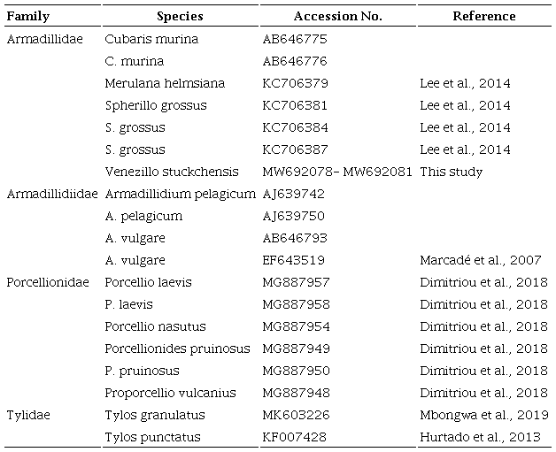 We carried out molecular and phylogenetic analyses limited to the study of 16S fragments. Genomic DNA was extracted from the pereiopods with Gentra Puregene tissue kit (Qiagen) following manufacturer’s protocol. Using specimens from the type locality we applied standard protocols to amplify fragments of the mitochondrial gene 16S. We obtained amplified products from 4 specimens, 2 males and 2 females. The PCR reaction mixture contained 75 ng DNA, 30 pmol of each primers 16Sar and 16Sbr (CGC CTG TTT ATC AAA AAC AT and CCG GTC TGA ACT CAG ATC ACG T; Palumbi et al., 1991), 1x PCR buffer (200 mM Tris HCl pH 8.4, 500 mM KCl), 2 mM MgCl2, 0.15 mM dNTP’s, and 1 U Platinum Taq DNA polymerase (Invitrogen, Sao Paulo, Brazil). Amplification conditions were 94 °C for 4 min, followed by 35 cycles of 94 °C for 30s, 50 °C for 30s and 72 °C for 1 min and a final extension for 5 min at 72 °C. Amplified products were sequenced at Macrogen, South Korea. We edited 16S sequences in DNA Baser 4.5 (www.dnabaser. com) and aligned them under default settings in Clustal X (Thompson et al., 1997). Haplotypic determination was carried out in DnaSP 5.10 (Librado & Rozas, 2009). We further explored the phylogenetic relationships of V. stuckchensis using GenBank sequences of other species of Armadillidae, and of Armadillidiidae, Porcellionidae and Tylidae (Table 1). The analysis was carried out using MrBayes v3.2 (Ronquist et al., 2012). Poorly aligned and divergent positions were trimmed using automated 1 method in TrimAl v1.2 (Capella-Gutiérrez et al., 2009) implemented in Phylomon2 (Sánchez et al., 2011). A best nucleotide substitution model for the phylogenetic analysis was selected under Bayesian information criterion from the jModeltest 2.1.4 (Darriba et al., 2012; Guindon & Gascuel, 2003) to implement in Bayesian Inference (BI) method. The BI was run in MrBayes for 10 million generations and a consensus tree was generated after burning 0.25 of the trees generated during the analysis. The consensus tree was viewed using the program FigTree v1.4.3.