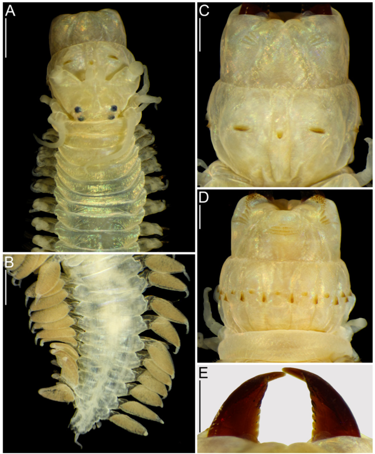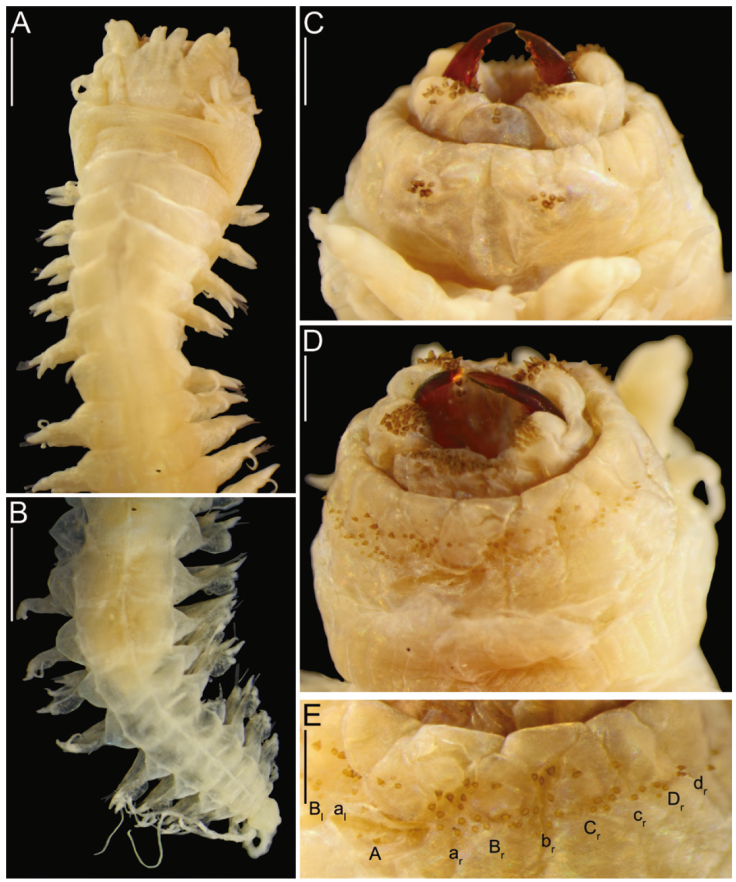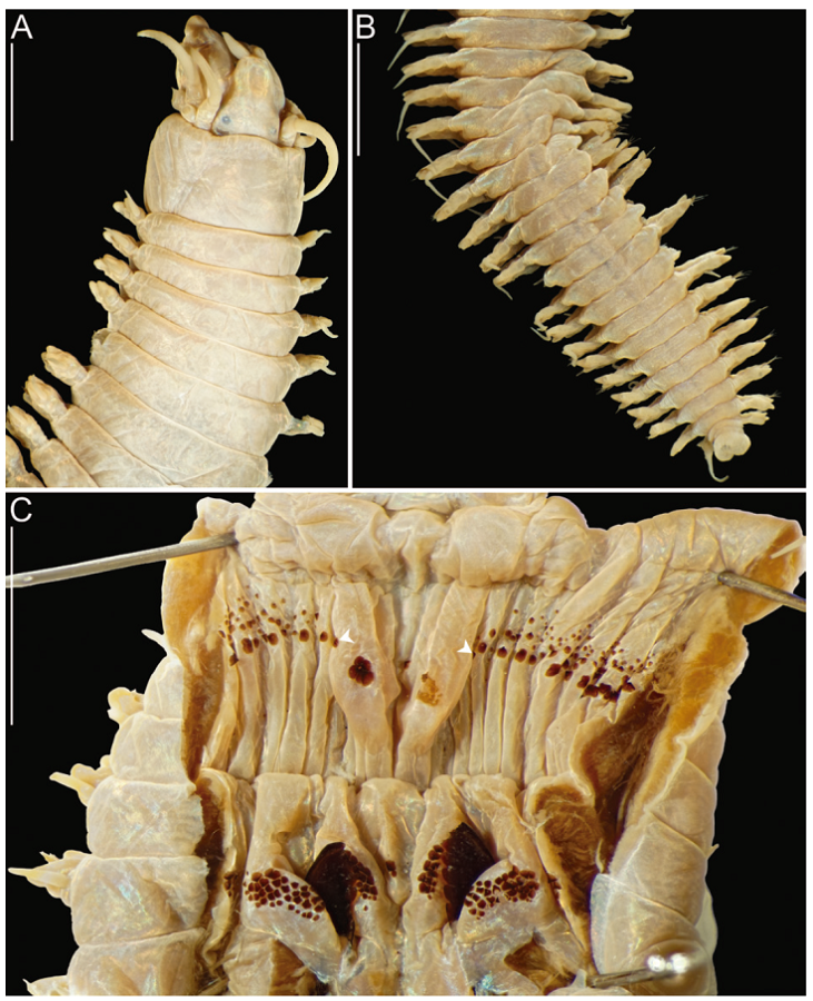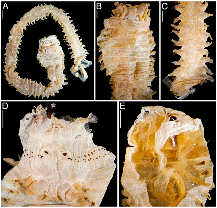 Description. Holotype (AMNH 1987) in good conditions, complete, 82 mm long, 5.5 mm wide at chaetiger 10 excluding parapodia, 63 chaetigers. Body pale, pigmentation absent (Fig. 3A, B).