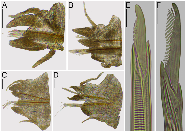Prostomium subpentagonal, as long as wide; anterior region distally entire, subtriangular, slightly longer than posterior region (Fig. 1A); anterolateral gap between antenna and palpophore as long as diameter of antennae (Fig. 1A). Antenna of left side distally incomplete, right one digitiform; antennae not passing the palps, gap between antennae very small (Fig. 1A). Palpophores ovoid, swollen, 1.5 longer than wide, shorter than prostomium, subdistal transverse groove present (Fig. 1A). Palpostyles subconical (Fig. 1A). Eyes almost entirely faded, reddish, anterior and posterior pairs rounded, subequal, in trapezoidal arrangement, eyes diameter slightly shorter than basal width of antennae, lenses visible, anterior big, covering almost all eye (Fig. 1A). Tentacular belt 1.5 times longer than chaetiger 1, partially covering posterior pair of eyes (Fig. 1A), with a small ventral flap (Fig. 1D). Tentacular cirri smooth, cirrophores ring-shaped, cirrostyles cirriform; posterodorsal tentacular cirri missing in larger specimen (Fig. 1A), in smaller syntype reaching chaetiger 4. Pharynx everted corrugated, partially dehydrated, oral ring 1.5x wider than maxillary ring (Fig. 1C, D). Jaws with inner margin dentate, more than 8 teeth (not extracted) (Fig. 1C, D). Maxillary ring: I = 3 cones in a vertical row; II = 17-18 cones in arc; III = 42 in a large rectangle; IV = 32-38 cones in round (Fig. 1C-D), merged paragnaths absent. Oral ring: V = 0; VI = 6-7 in a rectangle; VII-VIII = 98 small cones in 2 bands, anterior band with 32 paragnaths placed in ridge regions A-C and furrow regions a-c; posterior band with 66 paragnaths placed in ridge regions A-E and furrow regions a-e (Fig. 1C-E). Furrow pattern of areas VI-V-VI, λ-shaped (Fig. 1C). Dorsal cirrus digitiform in first 2 chaetigers, filiform thereafter, attached basally to dorsal ligule in anterior chaetigers, medially thereafter (Fig. 2A-D); 0.8x length of distal region of dorsal ligules in anteriormost chaetigers (Fig. 2A), 1.3-1.4x longer in anterior and middle chaetigers (Fig. 2B, C), 2.5x in posterior chaetigers (Fig. 2D). Dorsal ligule with distal region longer than proximal ones in anterior chaetigers, becoming shorter toward middle and posterior chaetigers (Fig. 2A-D). Distal region of dorsal ligule subconical throughout; 1.8x longer than median ligule in anterior chaetigers (Fig. 2B), 1.2x in middle chaetigers (Fig. 2C), 0.8x length in posterior chaetigers (Fig. 2D). Median ligule subconical with blunt tip in anteriormost chaetigers, slightly lanceolate in anterior and middle chaetigers, subconical with pointed tip in posterior ones (Fig. 2A-D); 1.8x longer than neuroacicular ligule in anterior chaetigers (Fig. 2B), 1.5x in middle chaetigers (Fig. 2C), 2.5x in posterior chaetigers (Fig. 2D). Neuroacicular ligule subconical throughout, superior and inferior lobes absent (Fig. 2A-D). Neuropodial postchaetal lobe rounded, shorter than neuroacicular ligule throughout (Fig. 2A-D). Ventral ligule subconical with blunt tip throughout; 3.4x longer than neuroacicular ligule in anteriormost chaetigers (Fig. 2A), as long as in anterior chaetigers (collapsed in Fig. 2B), 1.4x in middle chaetigers (Fig. 2C), 2x in posterior chaetigers (collapsed in Fig. 2D). Ventral cirrus digitiform in first chaetigers, filiform thereafter (Fig. 2A-D); 0.5x length of ventral ligule in anteriormost chaetigers (Fig. 2A), 0.8x in anterior chaetigers (Fig. 2B), 0.5x in middle chaetigers (Fig. 2C), 0.7x in posterior chaetigers (incomplete in Fig. 2D). Aciculae amber throughout, becoming lighter toward posterior chaetigers (Fig. 2A-D); notoaciculae absent in first 2 chaetigers (Fig. 2A); both noto- and neuroaciculae of similar thickness throughout. Most chaetae broken or blades missing. Notochaetae consisting of homogomph symmetrical spinigers and falcigers. Spinigers with blades pectinate, teeth minute, decreasing in size toward blade tip, replaced by homogomph falcigers in posterior chaetigers. Falcigers with symmetrical rim of shaft; blades slightly falcate, 6 coarse teeth, one third of inner margin edentulate, blade tip stout, tendon not observed (Fig. 2E). Neurochaetae consisting of homogomph spinigers and heterogomph falcigers in supra-acicular fascicles, heterogomph spinigers and falcigers in infra-acicular ones, most blades detached or broken. Spinigers with blades as in notopodial ones. Infra-acicular falcigers with blades pectinate, teeth increasing in size toward distal end, blade tip stout, tendon not observed (Fig. 2F).