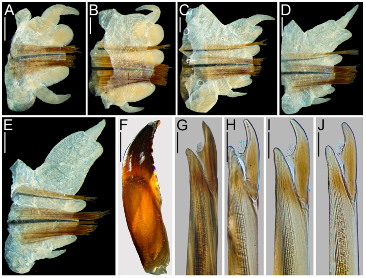 Prostomium subpyriform, as long as wide; anterior region distally entire, oblong, as long as posterior region, dorsal groove present (Fig. 5B); anterolateral gap between antenna and palpophore as long as diameter of antennae (Fig. 5B). Antennae subconical, not passing the palps, gap between them very small (Fig. 5B). Palpophores ovoid, swollen, 1.2x longer than wide, 0.8x length of prostomium, subdistal transverse groove present (Fig. 5B). Palpostyles subpyriform (Fig. 5B). Eyes blackish, rounded, anterior and posterior pairs subequal, eyes diameter half as long as antennae basal width, in trapezoidal arrangement, anterior pair placed on the dorsolateral margins of prostomium, lenses not visible, nuchal organs visible (Fig. 5B). Tentacular belt 1.3x longer than chaetiger 1, not covering posterior pair of eyes, anterior dorsal margin straight (Fig. 5B). Tentacular cirri smooth, cirrophores ring-shaped, cirrostyles cirriform; posterodorsal tentacular cirri reaching chaetiger 2 (Fig. 5B). Pharynx previously dissected, damaged, oral ring 1.6x longer than maxillary one (Fig. 5D). Jaws broad, inner margin with 7-8 rounded teeth (Fig. 6F). Maxillary ring: I = 1 cone; II = 14-16 cones in triangle; III = 27 cones in 4 rows (perhaps area incomplete); IV = 27-30 cones in 6 -7 rows (perhaps areas incomplete), merged paragnaths absent. Oral ring: V = 0; VI = 1-1 central shield-shaped paragnaths, 1-1 cone at the lateral margins bordering areas VII-VIII; VII -VIII = anterior band with 1 furrow row with 8 cones and a ridge row with 10 cones; posterior band with 1 furrow region with 8 cones and a ridge row with 13 cones; furrow and ridge regions with 1 or 2 paragnaths each, perhaps midventral area incomplete (Fig. 5D, E). Furrow pattern of areas VI-V- VI, Π-shaped (Fig. 5D). Caecal glands present (Fig. 5E) . Dorsal cirrus digitiform in first 2 chaetigers, subconical with blunt tip thereafter, attached basally to dorsal ligule in anteriormost chaetigers, medially in middle chaetigers, subdistally in posterior chaetigers (Fig. 6A- E); 1.6x longer than tip of distal region of dorsal ligule in anteriormost chaetigers (Fig. 6A), 3x in anterior and middle chaetigers (Fig. 6B-D), 2.5x in posterior chaetigers (Fig. 6E); 3.2x longer than proximal region of dorsal ligule in anteriormost chaetigers (Fig. 6A), 1.3-1.5x in anterior chaetigers (Fig. 6B), as long as in middle chaetigers (Fig. 6C, D), 0.4x length in posterior chaetigers (Fig. 6E). Dorsal ligule rounded in anterior chaetigers, becoming subcylindrical in middle chaetigers, and pennant-like in posterior chaetigers, with distal regions shorter than proximal ones throughout (Fig. 6A-E) . Distal region of dorsal ligule as long as median ligule in anterior chaetigers (Fig. 6B), 2.0-2.2x in middle chaetigers (Fig. 6C, D), 3.8x in posterior chaetigers (Fig. 6E). Median ligule rounded in anterior chaetigers, digitiform thereafter; 2.5x longer than neuroacicular ligule in anterior chaetigers (Fig. 6B), 1.5x in middle and posterior chaetigers (Fig. 6C-E). Neuroacicular ligule subconical throughout (Fig. 6A-E); superior and inferior lobes present in anterior and middle chaetigers, both rounded, inferior one slightly longer than superior one throughout (Fig. 6A-E). Neuropodial postchaetal lobes rounded, lamelliform, half as long as neuroacicular ligule throughout (Fig. 6A-E). Ventral ligule subconical with blunt tip in anterior chaetigers, digitiform thereafter (Fig. 6A-E); as long as neuroacicular ligule throughout (Fig. 6A-E). Ventral cirrus digitiform in first chaetigers, subconical thereafter (Fig. 6A-E); as long as ventral ligule in anteriormost chaetigers (Fig. 6A), 0.7x length in anterior and middle chaetigers (Fig. 6B-D), half as long as in posterior chaetigers (Fig. 6E). Aciculae dark brown and neuroaciculae almost twice thicker than notoaciculae throughout (Fig. 6A-E); notoaciculae absent in first 2 chaetigers (Fig. 6A). Notochaetae consisting of homogomph symmetrical spinigers throughout, decreasing in number toward posterior chaetigers (Fig. 6A-E). Neurochaetae consisting of homogomph symmetrical spinigers and heterogomph falcigers in supra-acicular fascicles, heterogomph spinigers and falcigers in infra-acicular fascicles. Blades of heterogomph falcigers in both fascicles falcate, blades decreasing their size toward posterior chaetigers, narrow teeth, a half of the inner edge edentate (Fig. 6G-J).