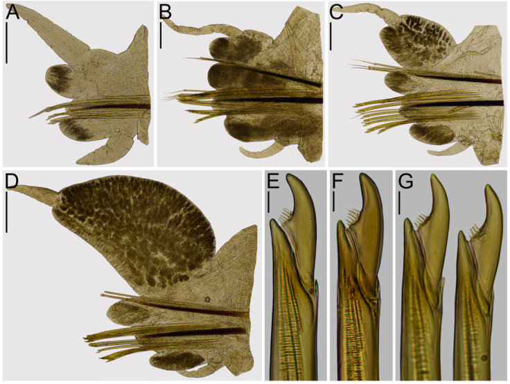 Prostomium subpyriform, as long as wide; anterior region distally entire, oblong, shorter than posterior region, dorsal groove present (Fig. 8A); anterolateral gap between antenna and palpophore half as long as diameter of antennae (Fig. 8A). Antennae subconical, not passing the palps, gap between them inconspicuous (Fig. 8A). Palpophores subcylindrical, 1.2x longer than wide, as long as prostomium, subdistal transverse groove absent (Fig. 8A). Palpostyles rounded (Fig. 8A). Eyes blackish, rounded, anterior pair slightly larger than posterior one, eyes diameter as long as antennae basal width, in trapezoidal arrangement, lenses not visible (Fig. 8A). Tentacular belt as long as chaetiger 1, not covering posterior pair of eyes, anterior dorsal margin straight (Fig. 8A). Tentacular cirrismooth, cirrophores ring-shaped, cirrostyles cirriform; posterodorsal tentacular cirri reaching chaetiger 5 (Fig. 8A). Pharynx everted, oral ring as long as maxillary one (Fig. 8C, D). Jaws broad, inner margin with 8-10 rounded teeth (Fig. 8E). Maxillary ring: I = 0; II = 27-28 p-bars arranged in 3-4 rows in triangle; III = 67 p-bars arranged in 4 rows in triangle; IV = 81-94 paragnaths in a sigmoidal patch, 45-56 p-bars arranged in 5-6 rows, 31-32 cones and 5-6 merged paragnaths arranged in arc. Oral ring: V = 1; VI = 1-1 central smooth bar; VII-VIII = anterior band with 1 furrow row with 12 p-bars and a ridge row with 9 cones in a single band, rows vertically displaced; furrow and ridge regions with 1 paragnath each (Fig. 8C, D). Furrow pattern of areas VI-V-VI, Π-shaped (Fig. 8C). Dorsal cirrus digitiform in first chaetigers, filiform in anterior, middle and posterior chaetigers, digitiform in posteriormost chaetigers, attached basally to dorsal ligule in anteriormost chaetigers, medially in anterior chaetigers, subdistally in middle and posterior chaetigers, distally in posteriormost chaetigers (Fig. 9A-D); 3.2x longer than tip of distal region of dorsal ligule in anteriormost chaetigers (Fig. 9A), 3.5x in anterior chaetigers (Fig. 9B), 5x in middle chaetigers (Fig. 9C), 11x in posterior chaetigers (Fig. 9D); 3.2x longer than proximal region of dorsal ligule in anteriormost chaetigers (Fig. 9A), 2.7x in anterior chaetigers (Fig. 9B), 1.2x in middle chaetigers (Fig. 9C), 0.3x length in posterior chaetigers (Fig. 9D). Dorsal ligule subconical with rounded, broad tips in anterior chaetigers, becoming subcylindrical in middle chaetigers, and oblong in posterior chaetigers, with distal regions shorter than proximal ones throughout (Fig. 9A-D); distal region of dorsal ligule as long as median ligule in anterior chaetigers (Fig. 9B), 2x longer in middle chaetigers (Fig. 9C), 3.4x in posterior chaetigers (Fig. 9D). Median ligule rounded in in anterior chaetigers, digitiform thereafter; as long as neuroacicular ligule in anterior chaetigers (Fig. 9B), 1.5x longer in middle chaetiger 31 (Fig. 9C), 2.7x in posterior chaetigers (Fig. 9D). Neuroacicular ligule subconical throughout (Fig. 9A-D); superior and inferior lobes present in anterior and middle chaetigers, both rounded, inferior one slightly longer than superior one throughout (Fig. 9A-D). Neuropodial postchaetal lobes rounded, lamelliform, half as long as neuroacicular ligule throughout. Ventral ligule rounded in anterior chaetigers, digitiform thereafter (Fig. 9A-D); twice longer than neuroacicular ligule in anteriormost chaetigers (Fig. 9A), half as long as in anterior and middle chaetigers (Fig. 9B, C), 0.3x length in posterior chaetigers (Fig. 9D). Ventral cirrus digitiform and broad in first chaetigers, narrower thereafter (Fig. 9A-D); 0.8x length of ventral ligule in anterior chaetigers (Fig. 9A, B), 0.7x in middle and posterior chaetigers (Fig. 9C, D). Aciculae dark brown throughout (Fig. 9A-D); notoaciculae absent in first 2 chaetigers (Fig. 9A); neuroaciculae becoming thicker than notoaciculae toward posterior chaetigers. Notochaetae consisting of homogomph symmetrical spinigers throughout, decreasing in number toward posterior chaetigers (Fig. 9A-D). Neurochaetae consisting of homogomph symmetrical spinigers and heterogomph falcigers in supra-acicular fascicles, heterogomph spinigers and falcigers in infra-acicular fascicles (Fig. 9E-G). Heterogomph spinigers present from about chaetiger 30. Blades of supra-acicular spinigers pectinate, teeth minute, decreasing in size toward distal end. Blades of heterogomph falcigers in both fascicles falcate, blades decreasing their size toward posterior chaetigers, narrow teeth, two third of the inner edge edentate (Fig. 9E-G).