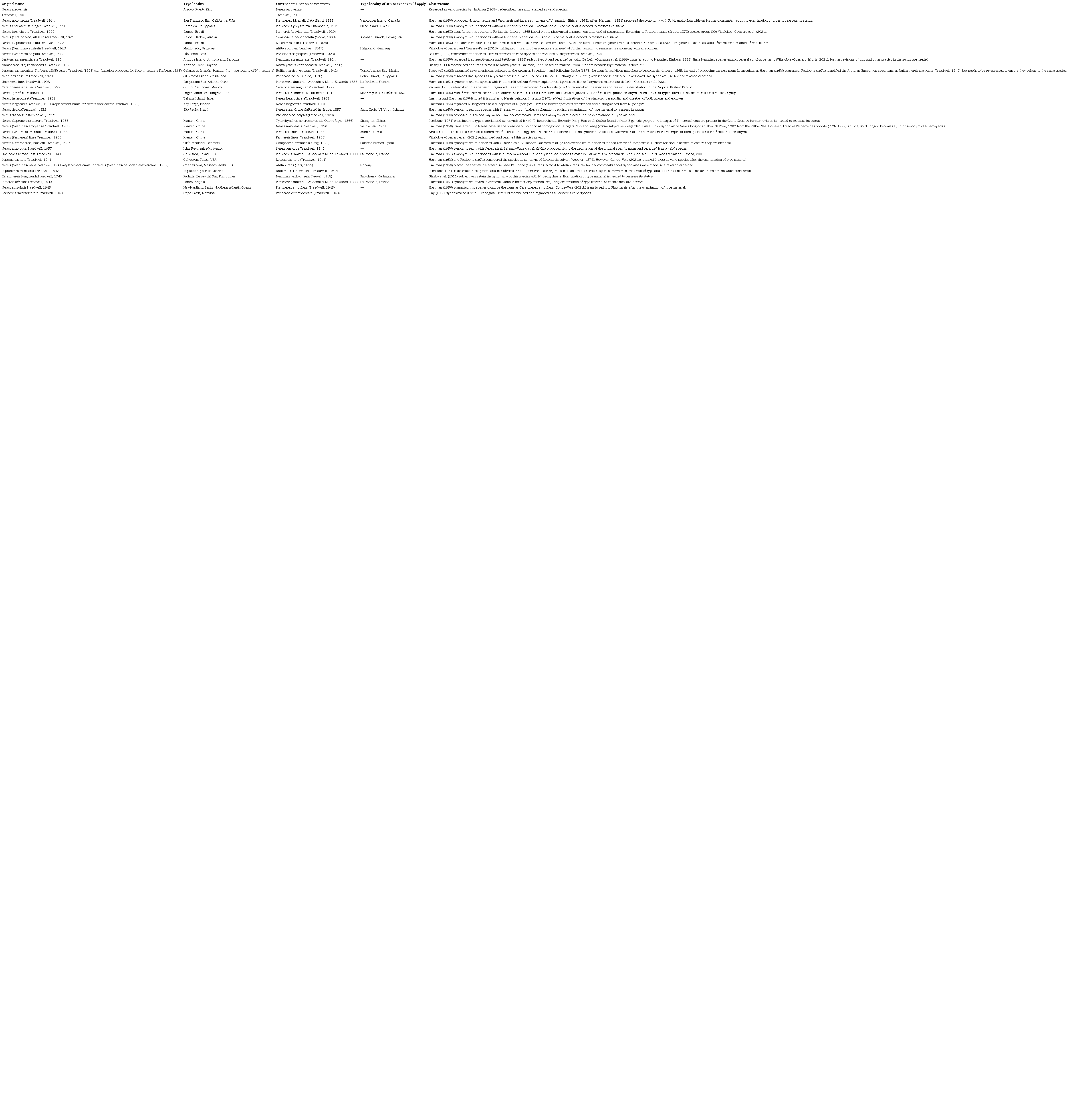 Three of the 4 species examined here were regarded as valid species. To facilitate future studies of Nereididae described by Treadwell, they are summarized in the Table 1 with additional comments. Of the 34 nereidid names proposed by Treadwell, 2 are replacement names, 16 are junior synonyms of other, 6 are valid and retain their original combination, and 10 are valid but they were transferred to another genus (Table 1).