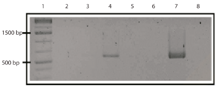 Reverse Transcription-PCR (RT-PCR) endpoint technique was used with specific primers for the 4 screened viruses (DENV, CHIKV, RABV, and ZIKV) for amplification of the viral sequences, but a qPCR (Quantitative Polymerase Chain Reaction) to quantify viral expression was not used because we had no thermal cycler with fluorescence sensors that could give absolute quantification readings of the product. The PCR conditions and primers used are detailed in the supplementary material (Supplementary Material I: Table S1 to S5). The primers for each of the chosen viruses were selected according to their standard calibration use in medicine for diagnosis of the infection. These sequences are from highly conserved regions that allow an assertive diagnosis of the disease. The One-step RT-PCR kit (QIAGEN, Cat. No. /ID: 210212) was used to perform PCR amplification, according to the manufacturer’s specifications. All PCR products were visualized on 2% agarose gels stained with SYBR green®, using TBE 1X as a buffer for 40 minutes at 80 volts. We used a 50 bp ladder to assess the length of the amplified fragment. Positive controls for DENV, CHIKV, RABV, and ZIKV were obtained with the QIAamp Viral RNA kit (QIAGEN, Cat. No. /ID: 52904) from optimized source cultures isolated in the Virology and Immuno-Virology laboratory. RNA-free PCR was performed as a negative control (Chien et al., 2006).