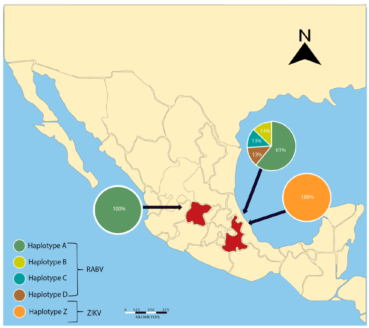 The wide diversity of viruses harbored by bats has been revealed by their extensive surveillance in the wild (Quan et al., 2013). These studies have determined a recent list of virus-bat relationships with a total number of 12 distinct viral families associated with the bats (Calisher, 2015; Calisher et al., 2006). The hematophagous vampire bat (Desmodus rotundus) is of great importance within the Chiroptera order since it is considered a species of relevance to public and veterinary health, particularly because of its propensity to spread rabies in livestock. Rabies transmitted by D. rotundus represents a risk to the health of cattle and its importance has been recognized in Latin America, where vampire bats are considered the main natural source of infection and reservoir of the etiological agent (Nadin-Davis & Loza, 2006; Velasco et al., 2006). The rabies virus (RABV) belongs to Lyssavirus (family Rhabdoviridae) and is transmitted via the saliva of infected animals through bites. Given their hematophagous habits, vampire bats usually cause serious epidemiological problems in livestock, in addition to considerable economic losses (Anderson et al., 2014). However, vampire bats can be asymptomatic reservoirs of viruses or can be productively infected with mortal consequences. In addition to rabies, vampire bats can be reservoirs of other viruses of human public health importance, such as some arbovirus belonging to the families Flaviviridae and Togaviridae (Kading & Schountz, 2016) that were included in this work (DENV, ZIKV, and CHIKV). Some studies support the evidence of infections in these bats; however, their relevance in the infection cycle is still unknown, which makes them an ideal ecological study model within the field of virology to elucidate their role as a potential reservoir for the dispersal of emerging viruses. Lack of studies on bat population in arbovirus such as ZIKV and CHIKV in Mexico supports the idea of carrying out new searches.