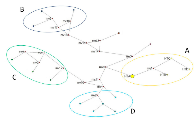 We were able to infer the genotype network only with RABV sequences. The grouping of the strains is represented by different colors (Fig. 3). All variants of RABV included in the genotype network are derived from the same theoretical ancestor (Median Vector 9 = mv9). We determined that genotypes B, C, and D came from the same hypothetical ancestor (mv1), which originated from genotype A (HTA). The size of genotype A is represented with a larger circle because of its abundance in our findings. Each putative ancestor represents a strain for which we have no sequence but is the only possible strain to give rise to each variant (Fig. 3).