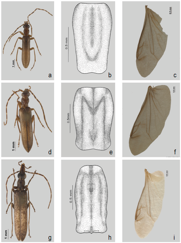 Macho. Largo 8.2 mm, ancho 1.58 mm (fig. 1g). Coloración: cabeza color café, márgenes laterales posteriores a las fosetas antenales amarillos, mandíbulas amarillas a excepción del ápice color café, palpómeros maxilares color café, con parte basal ligeramente amarilla, palpómeros labiales cafés, antenas con base amarilla, el resto café. Pronoto café, con la parte media del margen anterior y posterior con 2 manchas amarillas; élitros pardos; prosterno, mesosterno y metasterno cafés. Cabeza: elongada, distancia interantenal 3 veces más pequeña que la distancia del margen posterior del ojo al clípeo (0.33 mm × 1.15); superficie con puntuación de diferentes tamaños, distribuida de manera homogénea en la cabeza, integumento chagrinado; revestimiento con finas sedas doradas procumbentes; labro cuadrado; último palpómero maxilar cultriforme; último palpómero labial obtriangular; foseta antenal alejada del margen anteromesal del ojo; antenas exceden longitud media elitral, antenómeros filiformes; primer antenómero recto (0.45 mm), segundo antenómero más pequeño que el tercero (0.34 mm × 0.42 mm); escotadura del último artejo antenal ausente; ojos reniformes pequeños, la mitad de la longitud de la cabeza (0.61 mm × 1.21 mm) y protuberantes, con emarginación poco marcada y redondeada; distancia interocular más pequeña que la distancia del margen posterior del ojo a la cresta epistomal (0.49 mm × 0.84 mm). Tórax: pronoto más largo que ancho (1.1 mm × 0.88 mm), rectangular con ligero ensanchamiento en la parte anterior, emarginado en margen anterior, superficie irregular, con 4 ligeras concavidades, 2 presentes lateralmente, 2 presentes en la parte media anterior y posterior, y un surco longitudinal medio, puntuación del pronoto de pequeña y concentrada, integumento chagrinado, con escasa pilosidad corta y procumbente de color dorado (fig. 1h); escutelo trapezoidal, superficie brillante, con numerosa puntuación pequeña y abundante pilosidad procumbente de color dorado; élitros paralelos, 3 veces más largos que anchos (4.75 mm × 1.58 mm), ápice de élitros ligeramente redondeados, integumento chagrinado, con abundante pilosidad dorada procumbente en toda la superficie elitral; con 3 costillas elitrales débilmente impresas, las 3 costillas de similar longitud, desvaneciéndose antes del ápice elitral; patas largas, delgadas; pro, meso y metatibias con 2 espolones; penúltimo tarsómero de 3 pares de patas bilobulado y con euplántula presente, uñas tarsales simples con base ligeramente redondeada. Ala membranosa: 3.30 veces más larga que ancha (8.2 mm × 2.5 mm), área apical 0.3 veces del total del largo del ala (2.91 mm × 8.2 mm), con mancha longitudinal ubicada en el área apical cercana a la celda radial; celda radial cerrada, vena r3 presente, vena r4 incompleta (no alcanzando a RP), ligeramente curvada, poco visible, unida a mitad de r3; bucle radio-medial estrecho; espolón medial recto, alcanzando margen del ala; área medial sin mancha medial; base de MP3+4 alejada de MP1+2; celda anal apicalmente aguda, más larga que espolón medial (1.2 mm × 0.72 mm), base de celda cercana a AA3; venas AA3 y CuA1+2 con el mismo origen; lóbulo anal amplio, vena AP3+4 presente y corta (fig. 1i). Abdomen: último esternito abdominal con emarginación amplia en margen posterior, ángulos laterales estrechados en parte media, con abundantes sedas pequeñas en toda la superficie (fig. 4a); último tergito ojival, margen posterior con pequeña emarginación, con abundantes sedas pequeñas en mitad posterior (fig. 4b), un poco más largo que el último esternito (0.88 mm × 0.52 mm); octavo esternito hendido en parte media, con abundantes sedas largas en mitad posterior y ápice (fig. 4c); octavo tergito emarginado no esclerotizado, con escasas sedas largas en ápice; spiculum gastrale en forma de "V"; noveno esternito de forma trapezoidal unido a proyecciones del spiculum gastrale (fig. 4d); noveno tergito truncado con ápice con emarginación redondeada, poco esclerotizado, sin sedas; tegminito ausente; tegmen poco más corto que el lóbulo medio (0.51 mm × 0.81 mm), sin apodemas basales, parámeros glabros, redondeados en ápice (fig. 4e); lóbulo medio robusto en la parte basal, ligeramente estrechado en la parte apical, sin esclerito de soporte, ápice romo curvado hacia la parte ventral (fig. 4f).