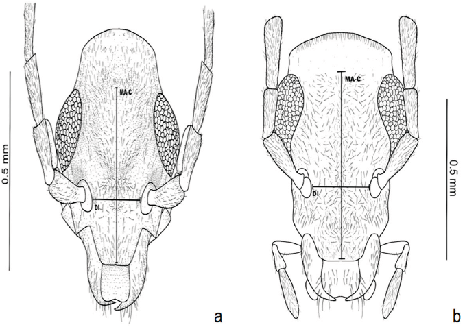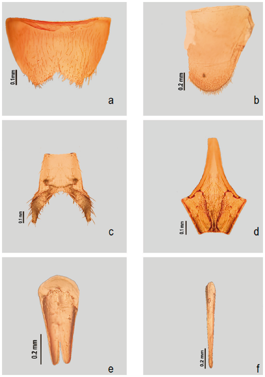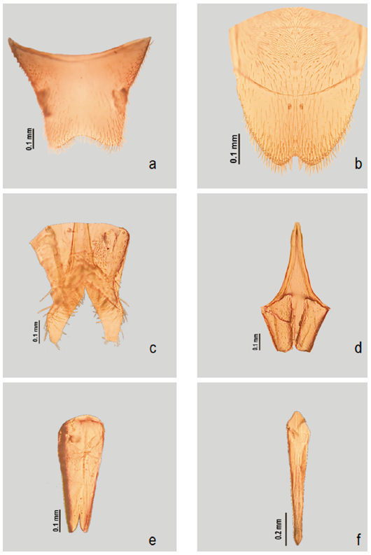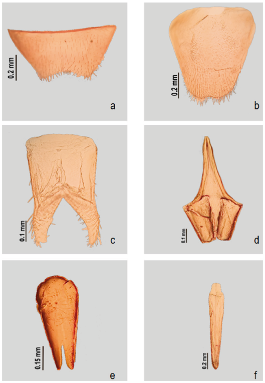 Para la observación de los terminalia, el abdomen de los especímenes fue extraído y puesto en una solución de KOH 10% durante 8 horas para ablandar el tejido. Posteriormente, fue colocado en una solución de alcohol al 70% durante 10 minutos, para proceder a disectar los genitales, esternitos y tergitos VII-IX. Al finalizar las observaciones las estructuras se conservaron en microviales con glicerina.