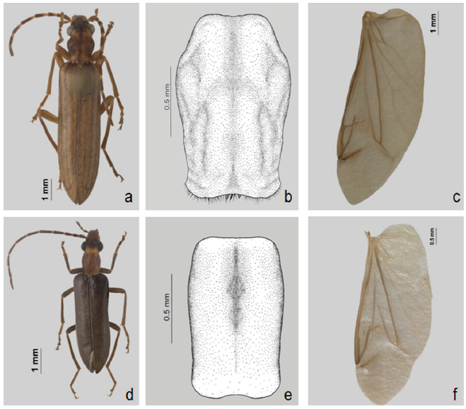Macho. Largo 6.33 mm, ancho 1.36 mm (fig. 1d). Coloración: cabeza color café, clípeo con el margen anterior amarillo, mandíbulas amarillas a excepción del ápice color café, palpómeros maxilares color café con la parte basal amarilla, palpómeros labiales amarillos, antenas con base amarilla, el resto café. Pronoto café con parte media del margen anterior y posterior amarillos; élitros color amarillo con manchas cafés en la base de los élitros; prosterno café con margen posterior amarillo, mesosterno y metasterno cafés. Cabeza: corta, distancia interantenal 2 veces más pequeña que la distancia del margen anterior del ojo al clípeo (0.39 mm × 0.86 mm); superficie con puntuación pequeña y distribuida de manera homogénea en la cabeza, integumento brillante y liso; revestimiento con finas sedas doradas procumbentes; labro subtrapezoidal; último palpómero maxilar triangular; último palpómero labial obtriangular; foseta antenal próxima al margen anteromesal del ojo; las antenas exceden la longitud media elitral, antenómeros filiformes; primer antenómero ligeramente curvado (0.41 mm); segundo antenómero más pequeño que el tercero (0.29 mm × 0.4 mm); escotadura del último artejo antenal ausente; ojos reniformes grandes, poco más de la mitad de la longitud de la cabeza (0.52 mm × 0.95 mm) y protuberantes, con la emarginación poco marcada y redondeada; distancia interocular un poco más pequeña que la distancia del margen posterior del ojo a la cresta epistomal (0.52 mm × 0.55 mm). Tórax: pronoto más largo que ancho (1 mm × 0.88 mm), cordiforme, ligeramente emarginado en margen anterior y posterior, superficie irregular, con un surco en forma de "M", lateralmente con 2 ligeras concavidades y surco medio longitudinal interrumpido por una pequeña concavidad en forma de "V", puntuación del pronoto de diferentes tamaños y esparcida, integumento chagrinado, con escasa pilosidad corta y procumbente de color dorado (fig. 1e); escutelo rectangular, superficie brillante, con escasa puntuación y abundante pilosidad procumbente de color dorado; élitros paralelos, ápice de los élitros poco más de 3 veces más largos que anchos (4.5 mm × 1.37 mm), integumento chagrinado, con abundante pilosidad dorada procumbente en casi toda la superficie elitral a excepción del ápice donde es decumbente; con 3 costillas elitrales fuertemente impresas, de similar longitud, desvaneciéndose antes del ápice elitral; patas largas, delgadas; pro, meso y metatibias con 2 espolones; penúltimo tarsómero de 3 pares de patas bilobulado y con euplántula presente, uñas tarsales simples con base ligeramente redondeada. Ala membranosa: 2.8 veces más larga que ancha (5.95 mm × 2.12 mm), área apical 0.4 veces del total del largo del ala (2.60 mm × 5.95 mm), con una mancha longitudinal ubicada en el área apical cercana a la celda radial; celda radial cerrada, vena r3 presente, vena r4 incompleta (no alcanzando a RP), ligeramente curvada, poco visible, unida a la mitad de r3; bucle radio-medial estrecho; espolón medial recto, no alcanzando el margen del ala; área medial ausente de una mancha medial; la base de MP3+4 alejada de MP1+2; celda anal apicalmente aguda, más larga que espolón medial (0.66 mm × 0.59 mm), la base de la celda cercana a AA3; venas AA3 y CuA1+2 con mismo origen; lóbulo anal amplio, vena AP 3+4 presente y alargada (fig. 1f). Abdomen: último esternito abdominal con emarginación amplia en margen posterior, ángulos laterales no estrechados en parte media, con abundantes sedas pequeñas en toda la superficie (fig. 3a); último tergito ojival con abundantes sedas pequeñas en mitad posterior (fig. 3b), casi 2 veces más largo que el último esternito (0.96 mm × 0.45 mm); octavo esternito hendido en parte media, con abundantes sedas largas en la mitad posterior y el ápice (fig. 3c); octavo tergito emarginado poco esclerotizado solo en los márgenes laterales, la parte media membranosa, con escasas sedas largas en ápice y 2 pequeñas protuberancian en emarginación; spiculum gastrale en forma de "V"; noveno esternito de forma trapezoidal unido a proyecciones del spiculum gastrale (fig. 3d); noveno tergito con ápice redondeado, poco esclerotizado con escasas sedas en ápice; tegminito ausente; tegmen poco más corto que el lóbulo medio (0.56 mm × 0.87 mm), sin apodemas basales, parámeros glabros, redondeados en ápice (fig. 3e); lóbulo medio robusto en parte la basal, ligeramente estrechado en la parte apical, sin esclerito de soporte, ápice romo, curvado hacia parte ventral (fig. 3f).