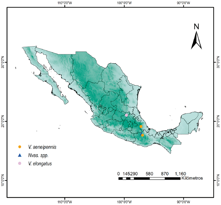 Vasaces elongatus (fig. 5d-f) se ha registrado únicamente para los EUA, Texas (montañas Chisos) (Arnett, 1953). Se registra por primera ocasión con 2 ejemplares para Querétaro: "México: Querétaro, Misión Bucareli, 21°02'28" N, 99°36'85.5" O, 01.III.1998, cols. G. Ortega y E. Barrera (2 ejemplares)" (fig. 6).